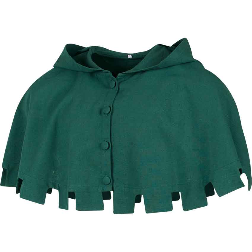 Crafted from pure cotton, this liripipe hood serves as an excellent addition to your medieval or fantasy outfit. Starting at the top, the medieval hood is roomy with a liripipe tail hanging down the back. This adds depth and dimension to the gugel hood’s design. In the front, it has buttons that secure it closed. The hood is attached to a crenellated mantle that covers the shoulders and top of the chest. These crenellations look like the crenellations of castle walls.
