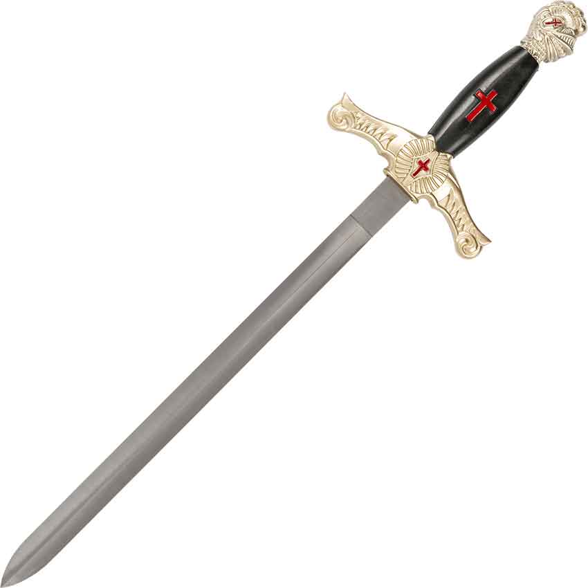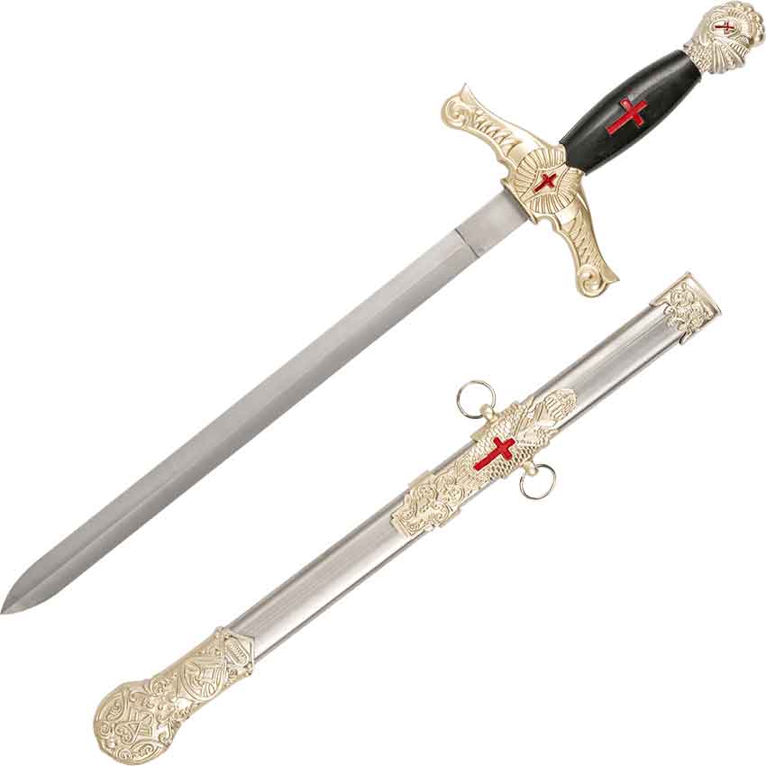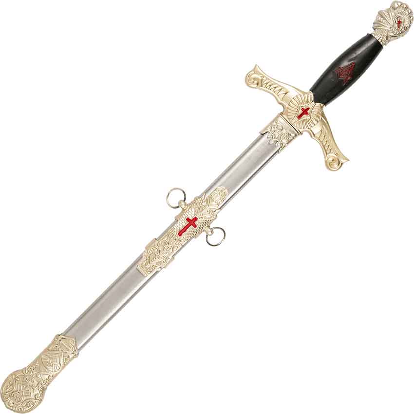 Finally, this Crusader dagger comes with a matching scabbard. The scabbard has an ornately detailed chape and throat. There is also a detailed section with two rings for attaching a belt, not included. The chape and throat have scrollwork details. There is a red cross with a scaled background in the center of the ring section. This dagger makes a great addition to a costume or weaponry collection. You can display the Crusader Knight Masonic Dagger in your home or office.