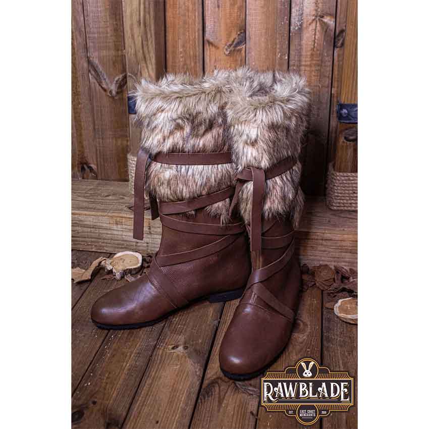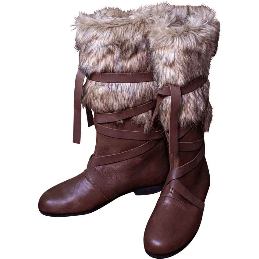 Each calf-length boot has a non-slip sole for better traction. These boots have faux fur cuffs. The fur color will vary from light to dark brown. Leather strips wrap around the medieval boots and tie at the middle of the cuffs. The Cymmerian Boots work well for reenactments, LARP events, and Renaissance faires.