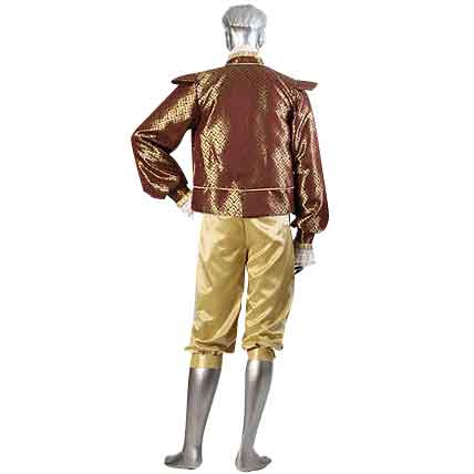 The design of the Damask Renaissance Doublet makes it seem like a traditional doublet from the eras of antiquity. However, the one thing that separates this doublet from its ancestors is the quality of the material and the design it features. This beautiful doublet is made from attractive damask brocade. It features an extremely attractive and incredibly detailed gold and burgundy pattern. Thanks to the material, the jacket glimmers in the light like a thin sheet of gold. This doublet features a low-cut collar that wraps around the neck, as well as exaggerated shoulder-pads that broaden the wearers silhouette. The full-length sleeves are loose-fitted and gathered at the wrist in a narrow cuff. The interior of this modern-day doublet is fully-lined, making it comfortable to wear for extended periods of time. The doublet is pictured above with a renaissance shirt and a pair of knee-breeches, although it should be noted that the doublet does not include either the shirt or the breeches. The Damask Renaissance Doublet is a vivid and eye-catching piece that is sure to make whoever wears it the center of attention. After all, it is quite hard to ignore something that glimmers like gold in the light.