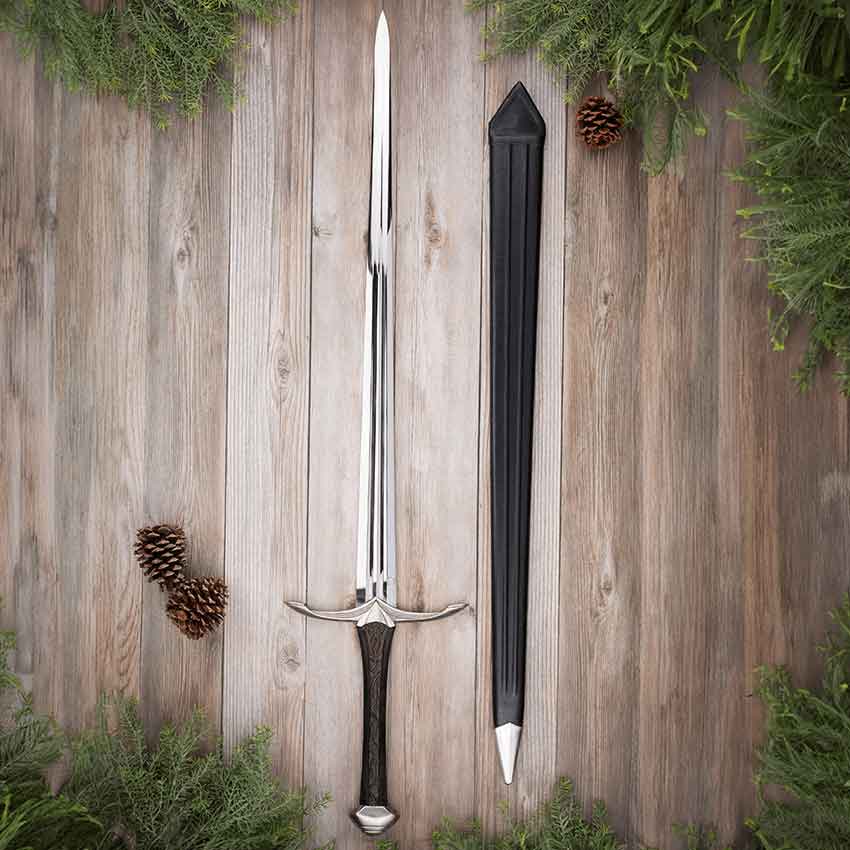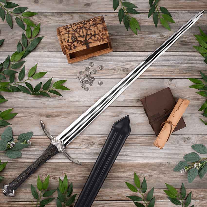 Finally, this sword comes with a wooden scabbard. Black leather covers the scabbard. It has a steel chape as well as ridges running down its length. This fantasy sword is perfect for anyone wanting to fight as a mighty elf on the battlefield.