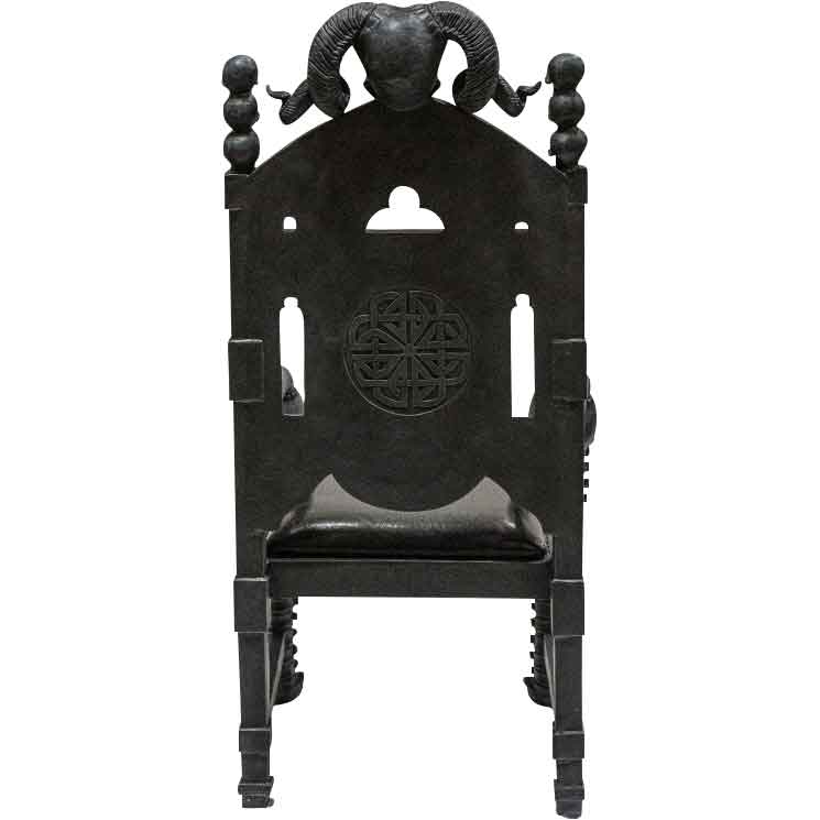 Starting with the back rest, it has a padded circle in the middle. This ensures you’re comfortable when sitting in this dark fantasy chair. Above the padding is an intricately carved baroque structure with trefoil arches and intricately carved knotwork borders. A horned skull peers over the the chair. Behind the back rest is a square knotwork design. These horns spiral out to the side and act as the chair’s top rail. Each ear of the chair is a stack of three black atop pillars with carved knotwork.