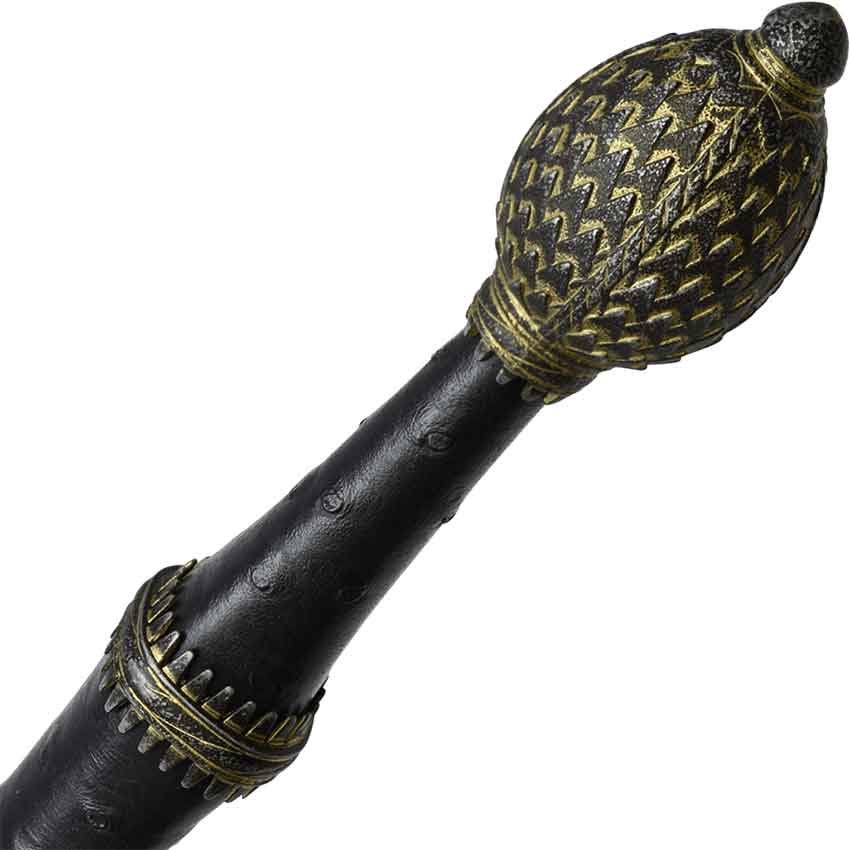 This long, thin Targaryen sword has a black handle wrapped in leather with antiqued gold accents. The cast metal pommel is shaped like a scaled dragon egg with a peen block on the bottom. The middle of the grip has a band designed like dragon’s teeth. Another band designed like dragon’s teeth is located just below the crossguard.
