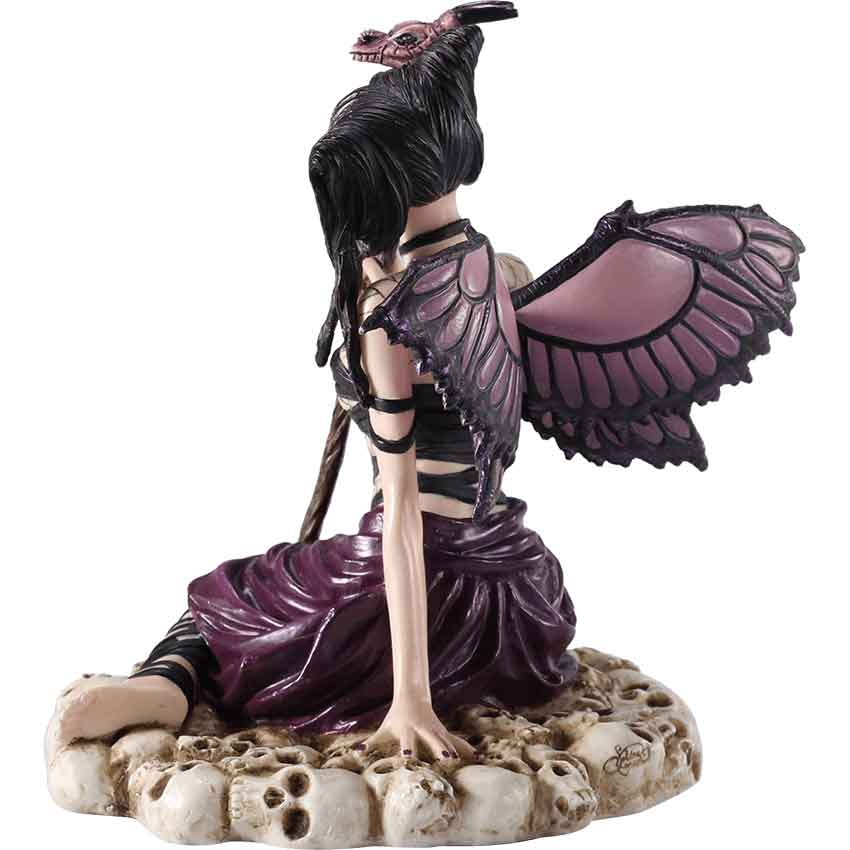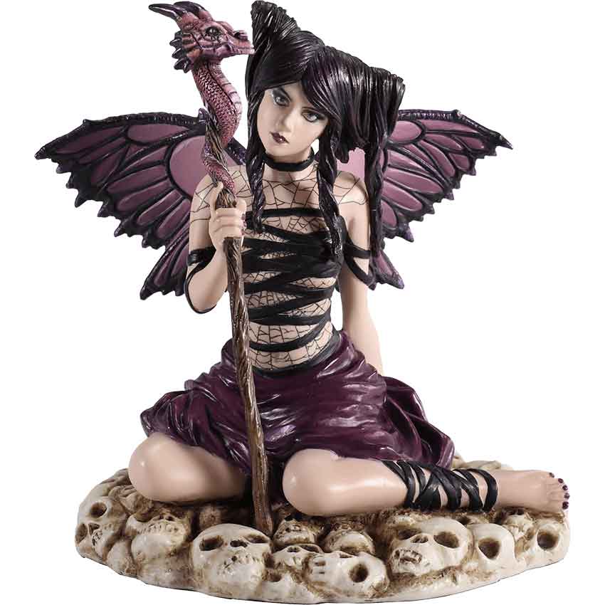 This hand-painted gothic fairy sits upon a ground of skulls. She wears a strappy spiderweb-laced top with a deep purple skirt. Black wraps on her legs match the straps of her black top. This gothic fairy tilts her head as she looks at the viewer. Her hair forms a pair of horns and then dangles past her shoulder.