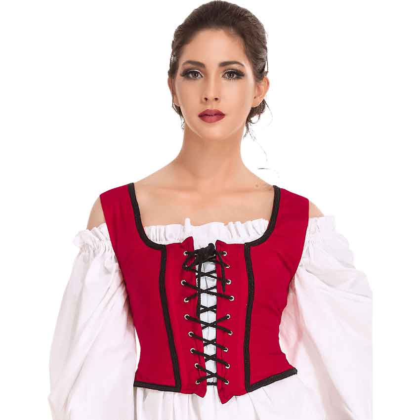 The Decorated Reversible Wench Bodice is an elegant reversible bodice made from highly durable soft viscose fabric that is decorated with laces in contrasting color. The wench bodice has eyelets and drawstring in the front and back for easy adjustability for a comfortable fit. Our reversible bodice has flexible boning in the front with loops and string on the back to give the perfect fit to the bodice. The Decorated Reversible Wench Bodice would make a perfect addition for any Renaissance or Medieval outfit. The reversible color options are Light Brown with Chocolate, Gold with Black, Green with Black, Red with Black, Hawaiian Ocean with Black, or Royal Blue with Black.