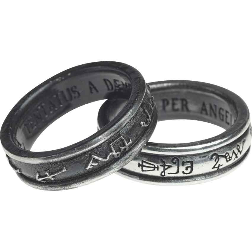 Demon Black and Angel White Rings, each is inscribed with seven signatures. The silver ring bears the seven traditional Archangels, while the black ring holds the signatures of seven spirits or angels who have fallen to darkness. Handcrafted from fine English pewter, the bands may be worn together or separately.