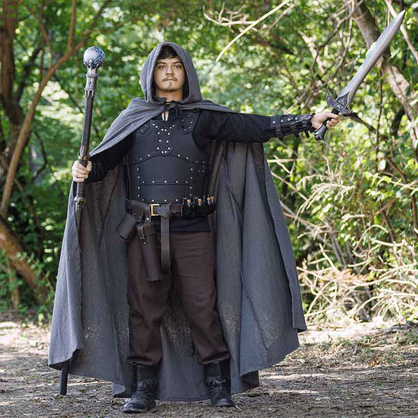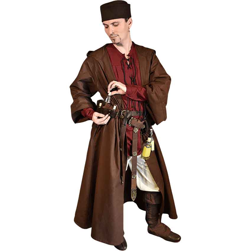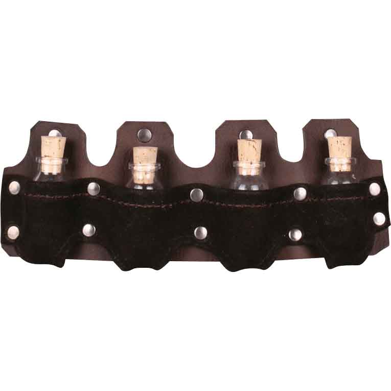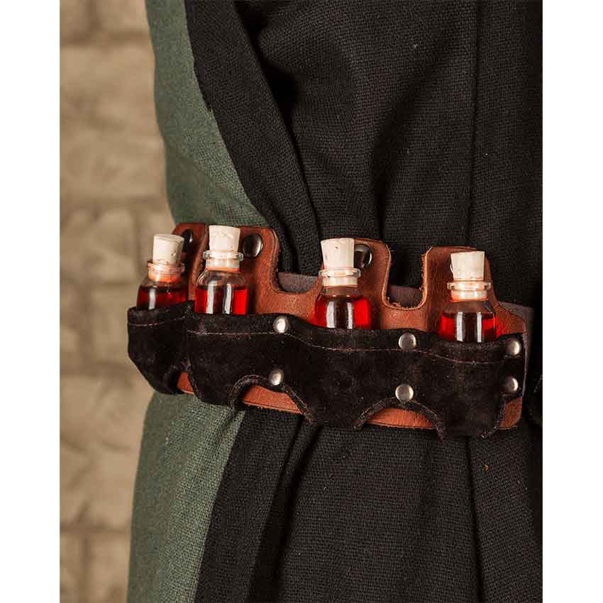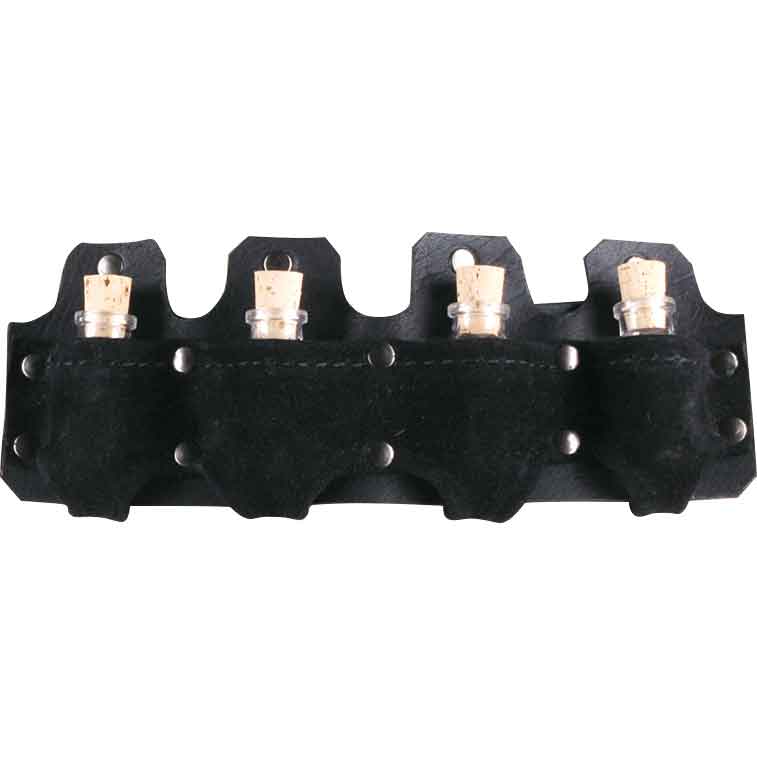 The alchemist, potions master, or mage requires easy access to their elixirs. For quick use and collecting rare ingredients in the wilds, the Doran Potions Belt Slide is a great choice. Available in black or brown, this pouch uses leather and suede to hold the corked glass bottles tightly with a metal rivet detail. Additional cloth can be wrapped around the bottles for securing better if desired. The pouch holds four bottles which are included. The medieval bottle holder can attach to belts for ease of access. It is ideal for a LARP event, Renaissance faire, or fantasy convention.
