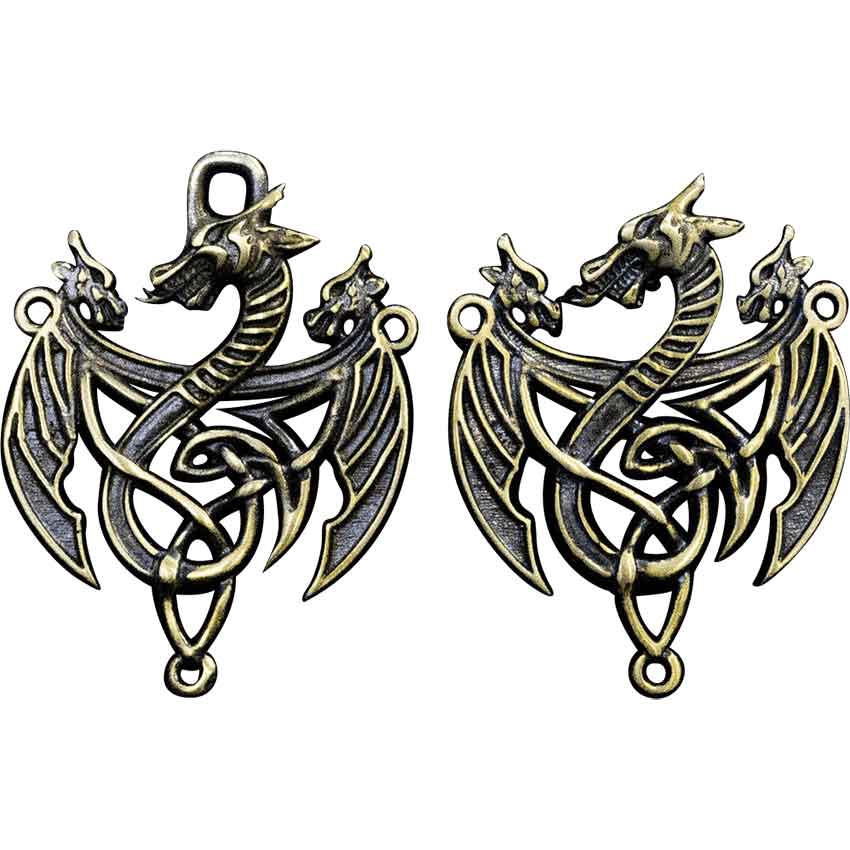 The design features two magnificent three-headed dragons with forked tongues and ornately banded necks, where every curve and twist is meticulously detailed. The secure clasp mechanism hidden behind their heads ensures that while your cloak catches the breeze, it stays firmly in place, seamlessly fusing style with functionality.