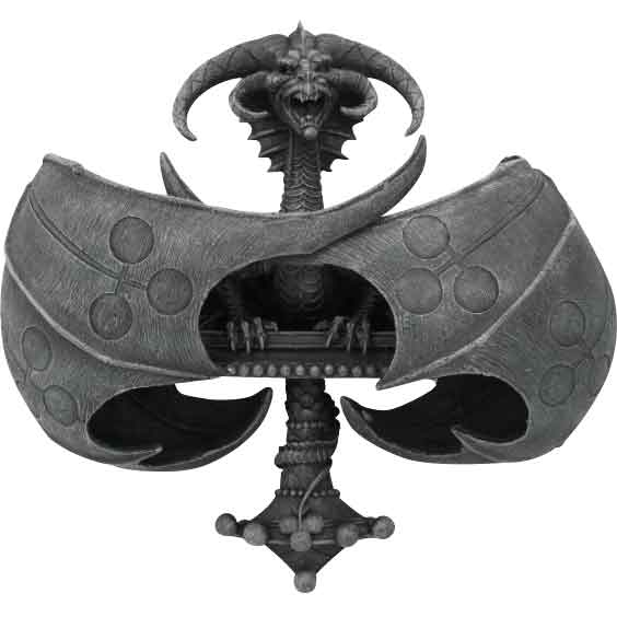 No set of cards is complete without the suit of clubs. This icon of game play decorates the Dragon Club Wall Plaque, a great home decor piece. This cold cast resin dragon forms the top half of the club with its head and wings. Etched club shapes adorn the wings. The horns of the dragon form a similar shape to the wings. The dragon appears to sit on a platform. The platform continues the club motif and completes the bottom half of the club. This plaque is hand painted to look like dark grey stone. It looks terrific when hanging next to the Dragon Heart Wall Plaque (CC12927), Dragon Diamond Wall Plaque (CC12928), or the Dragon Spade Wall Plaque (CC12929), sold separately. Hang it on your living room or office wall or give it as a gift for a dragon enthusiast.