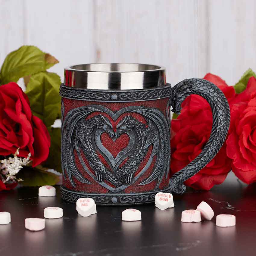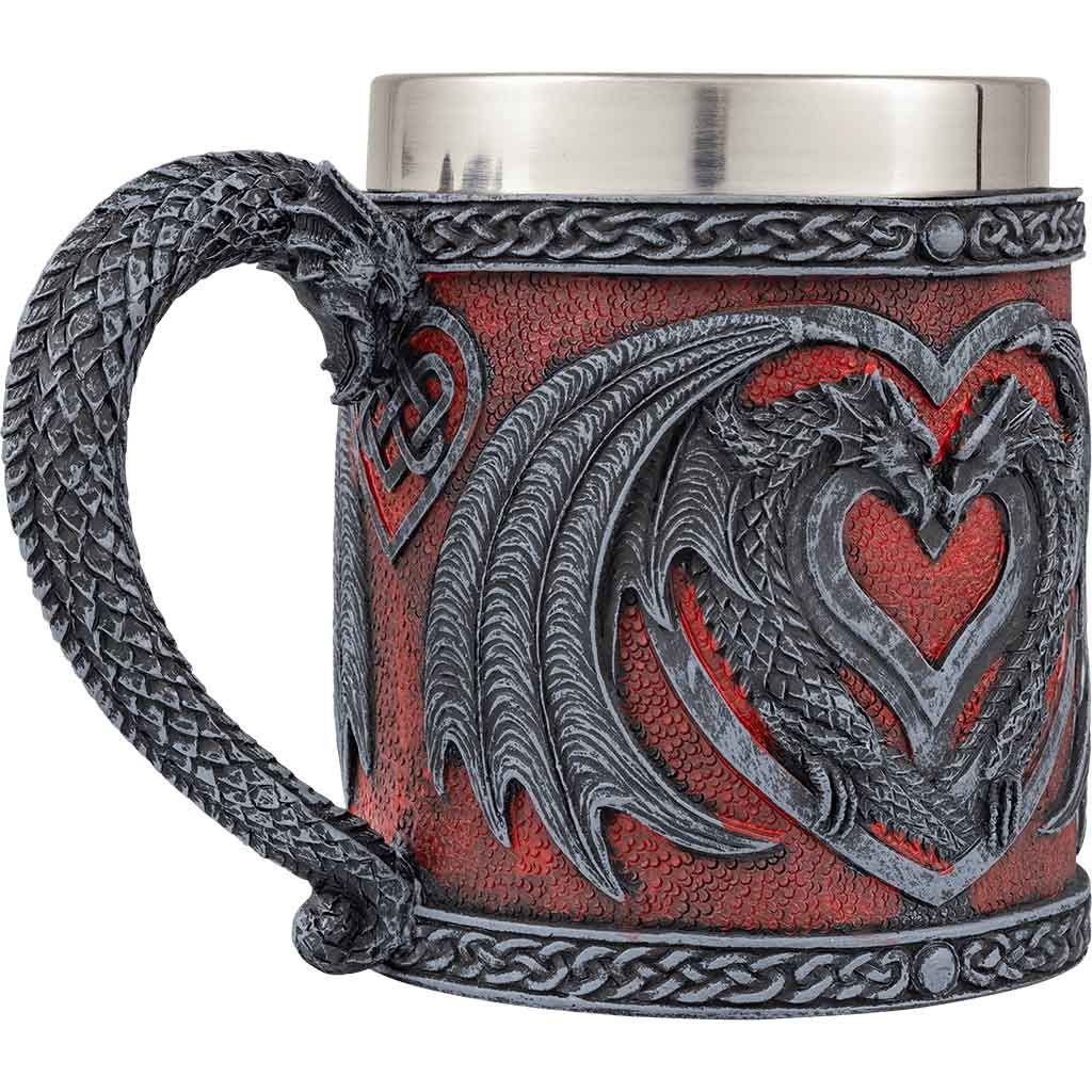 Fearsome though they might be, these dragons have a sweet spot for each other. The Dragon Heart Tankard features two dragons with their necks and wings curved into the shape of a heart, their snouts meeting together at the top. Made of high quality cold cast resin, this fantasy tankard is painted by hand to look like dark grey stone over a deep red background. The bottom and top edges of the dragon cup have a knotwork trim, and the handle is shaped like a dragon with its long neck curved into a half heart shape. The steel insert within makes this fantasy tankard safe to drink from, making it not only a romantic dragon collectible, but a functional addition to drinkware collections as well.