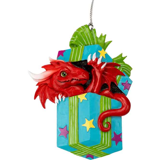 You can easily add a sense of whimsy to your holiday decorations by simply including the Dragon in Gift Christmas Ornament. This holiday ornament brings a touch of magic to any room in your home. Made from cold-cast resin, this hand-painted Christmas ornament features a one-sided design by the artist Ruth Thompson.