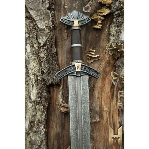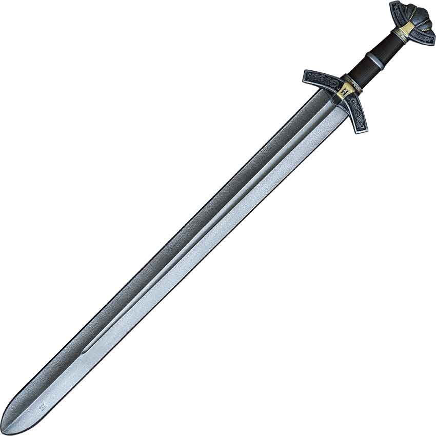 Within the forest, you and your men await the enemy. You shall emerge victorious this day. All of you wield the Steel Dreki LARP Sword in battle. This Stronghold LARP weapon has a lightweight, latex free construction safe for tough combat. The silver-colored blade has double edges with a fuller down its length. Next, the foam sword continues with a curved crossguard. It curves towards the blade. Also, it has the Stronghold emblem in the center. Stylized knotwork adorns the crossguard on either side of the emblem. Then, the handle continues with a brown, wood-like grip. The grip has a silver-colored ring in the center. Finally, the hilt ends with a lobed pommel. It also has stylized knotwork. Both the crossguard and pommel have a silver-coloring with some golden accents. Carry this foam sword into battle. It works with Viking and fantasy characters.