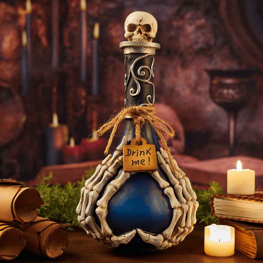 When you wish to decorate your wizards or sorcerers lair, make sure to add a potion bottle like the Drink Me Potion Bottle Statue. Made from cold-cast resin, this hand-painted potion bottle has a blue finish. A pair of white skeletal hands vertically grasp the sides of the rounded bottom of the bottle.