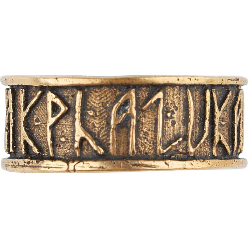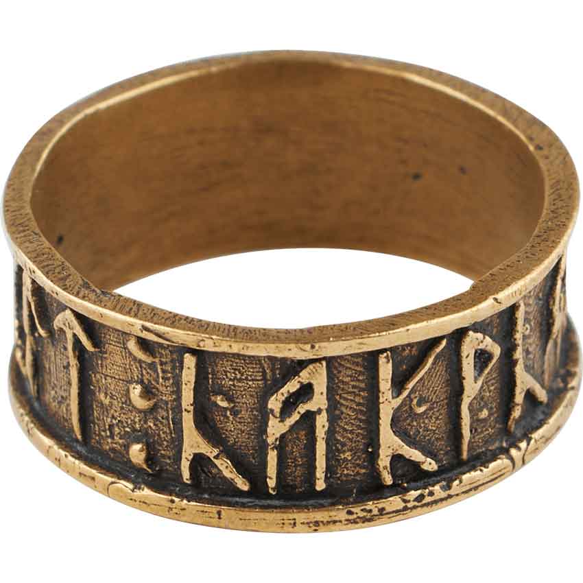 The robust design withstands the test of time, much like the indomitable dwarfs themselves. Adorned with the dwarvish language from the legendary grimdark universe, the ring’s message, “Khazukan Kazakit-ha!”—”Look out! The dwarfs are on the warpath!”—brings an authentic touch to this mystical piece. The antiqued gold-highlighted lettering set against a darker backdrop offers an elegant contrast, with intricate studs adding an additional layer of detail.