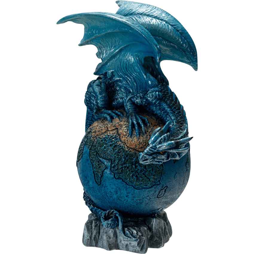 Step into a realm where fantasy meets the cosmos with this planet Earth dragon. Crafted from polyresin, this dragon statue features hand painted details that show off a true passion for art. The design depicts a blue dragon sitting on top of our homeworld, Earth, known for its continents and water-covered surface.