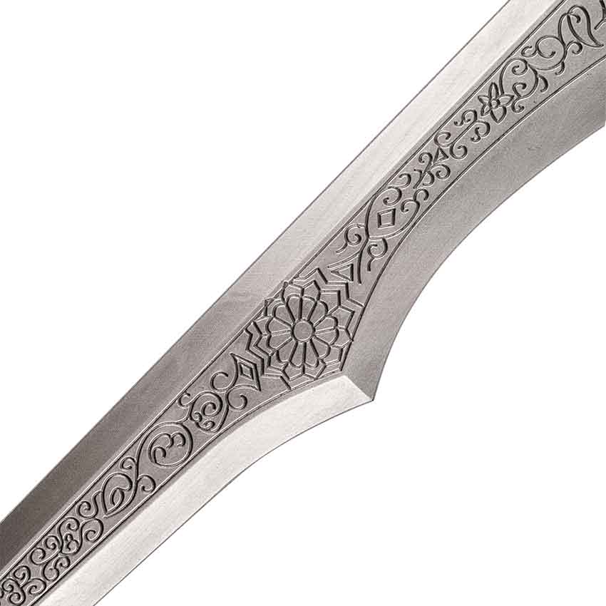 Made entirely from foam, this fantasy scimitar is inspired by sword styles from the Middle East with a subtle fantasy twist. This foam scimitar sword is an excellent cosplay prop. A fiberglass core in the center makes it a strong and flexible weapon. The brown handle has a distinct wood-like finish. The single, curved guard is painted gold like the curved pommel. The guard and the pommel have intricately carved filigree. Upon closer inspection, the langets also have intricately carved filigree. They’re shaped with wavy points that end in a fan. Moving down the length, single-edged blade has intricate details. Down the spine of the blade, there are two angled points that lend this scimitar its iconic shape. The intricately carved details have floral patterns, lotuses, and vine work in it.