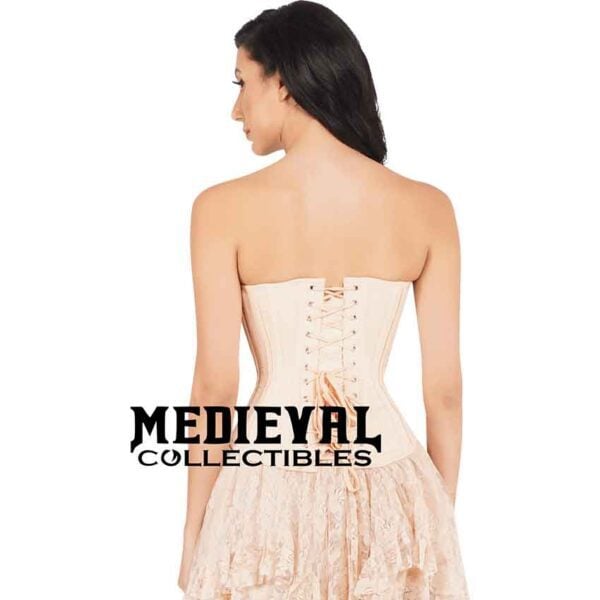 The overbust style of this cream corset features a sweetheart neckline and a curved lower front edge, swooping down in the middle and then cut higher at the hips. The front metal busk opening adds to its streamlined look.