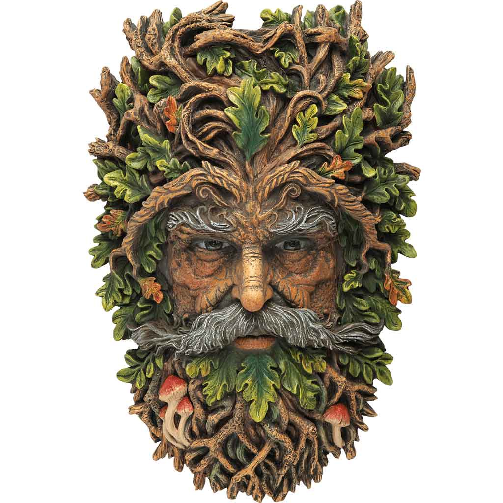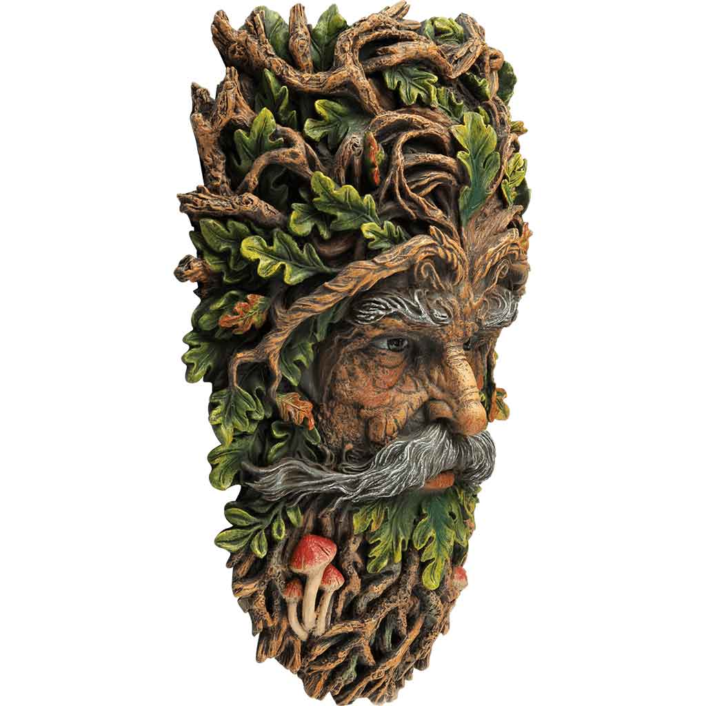 In the heart of the imaginary realm known as the Elderwood, this greenman awaits to shepherd the creatures of the forest with his stoic, yet benevolent gaze. This greenman wall planter is made from polystone, where every detail is painted by hand to draw inspiration from nature’s bounty. Polystone is a resin composite that utilizes powdered stone to create a sculpture that is lightweight like resin, but possessed of a natural, wood-like finish.