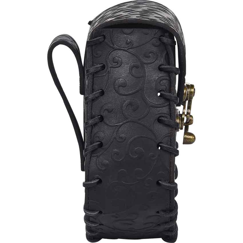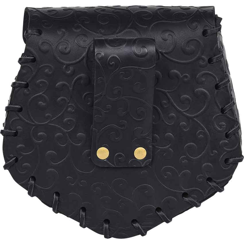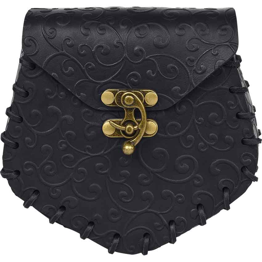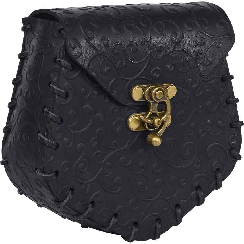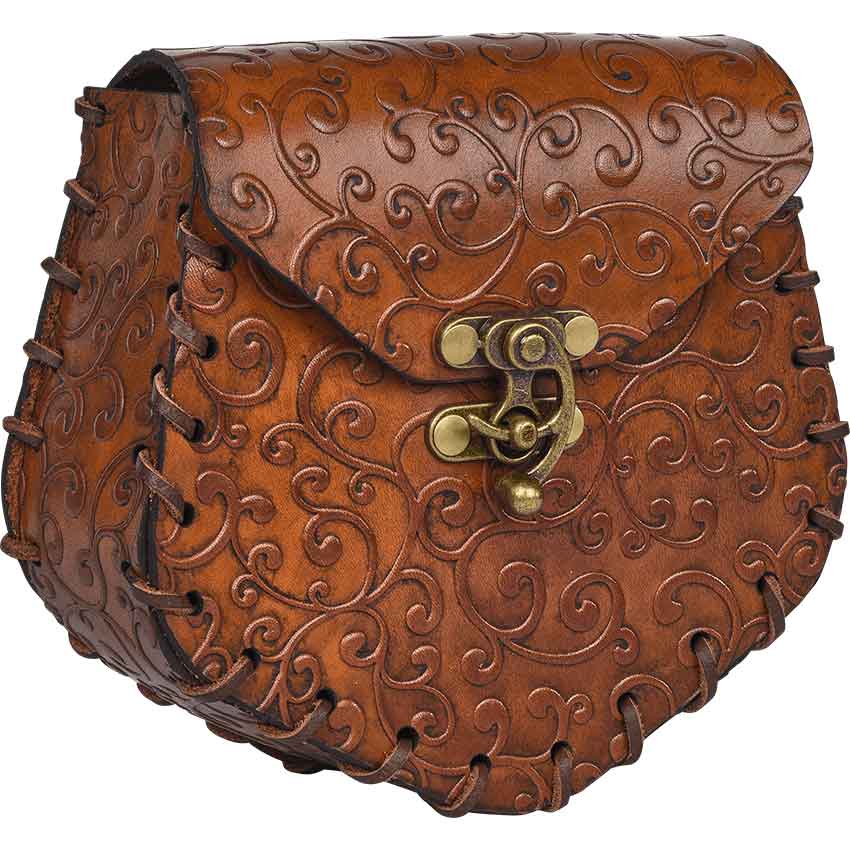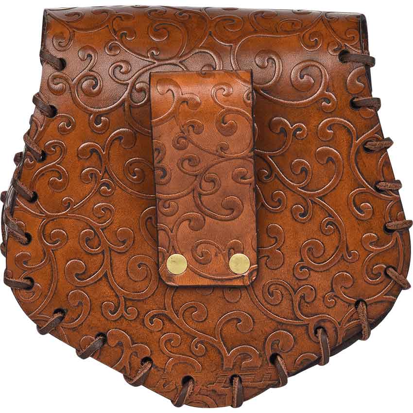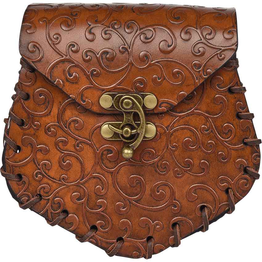 The Ren faire bag has angled sides with rounded corners. It features a front flap that secures with an antique brass swivel clasp in front. An elegant swirl pattern covers the elven bag. Lacing runs along the edges. On the back, there is a loop for hanging on a belt, not included. This leather belt bag is great for adding to a fantasy or medieval outfit.
