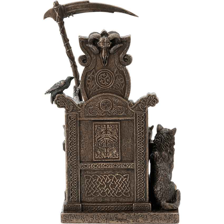 Ruling over the domain of the dead, the Norse goddess Hel is a mighty and mythical queen, depicted here in the Enthroned Hel Statue. Made from cold-cast bronze, this hand-painted statue depicts the goddess sitting on a throne. Knotwork detailing in addition to a rams skull adorns the throne.