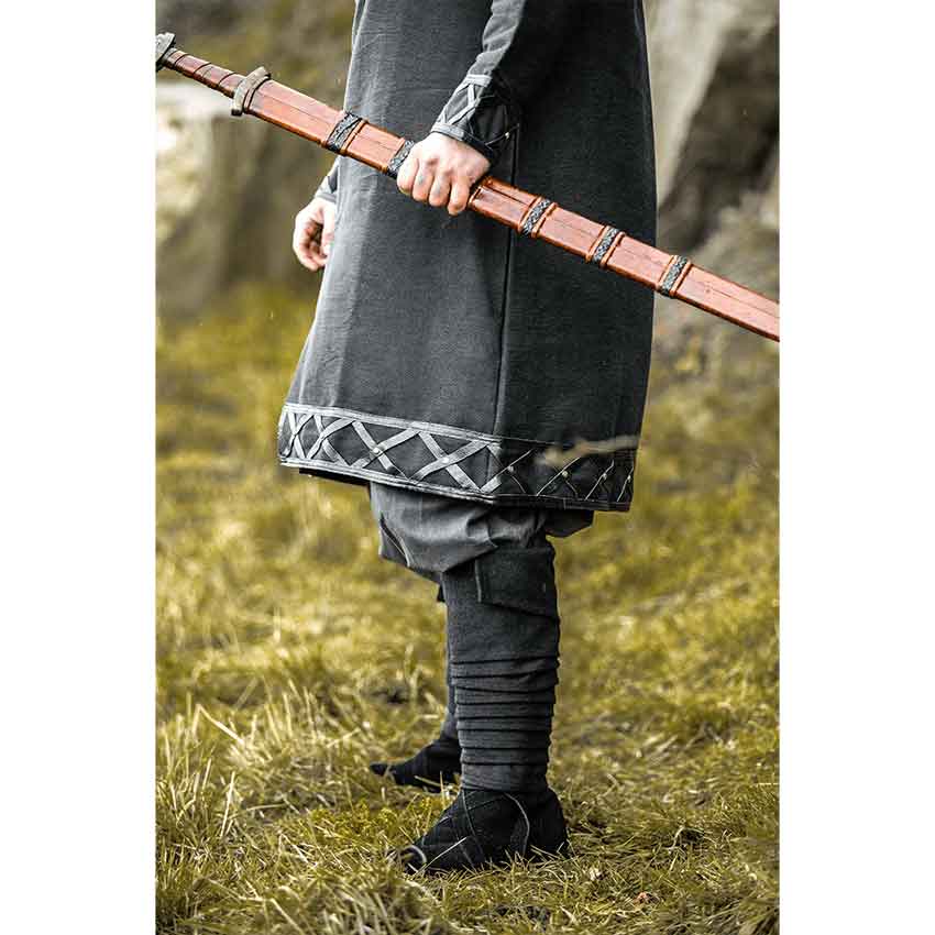 Then, this Nordic tunic features long straight sleeves and a length that ends around the knees on most. A slit in the front hem of the tunic allows for enhanced mobility in battle.