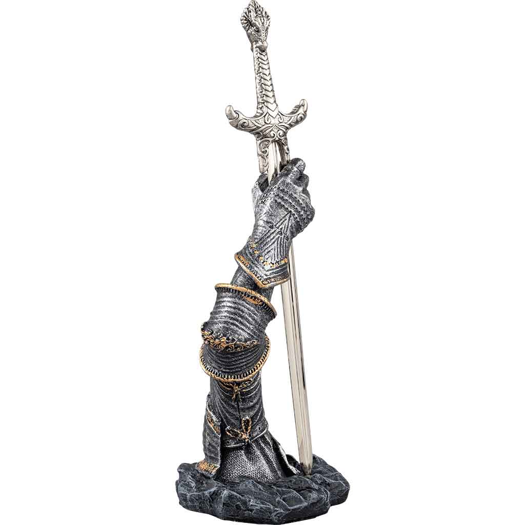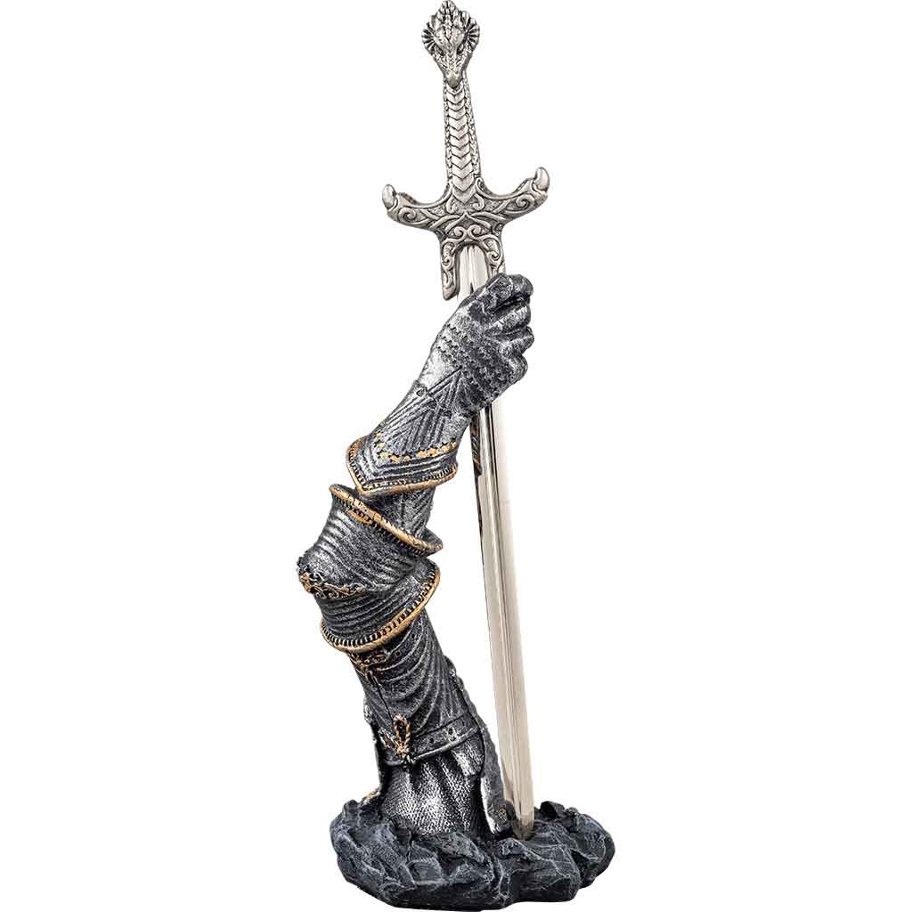 To have perished on the battlefield would be the most honorable death for the late king Arthur. In a final act of defiance, he raised Excalibur in honor of his fallen warriors in the Excalibur Letter Opener with Armored Arm Stand. This amazing Arthurian desk accessory honors the memory of the fallen king with the cold cast resin build of the sword and stand, its hand-painted design emphasizing the ornate detailing of the armor. The stand depicts the outstretched arm of an armor-clad Arthur. The miniature sword Excalibur is firmly planted in his grasp, but it remains easily removable to serve as a mail opener for when you need one. With the Excalibur Letter Opener with Armored Arm Stand, there is no workspace that will be without style or function!