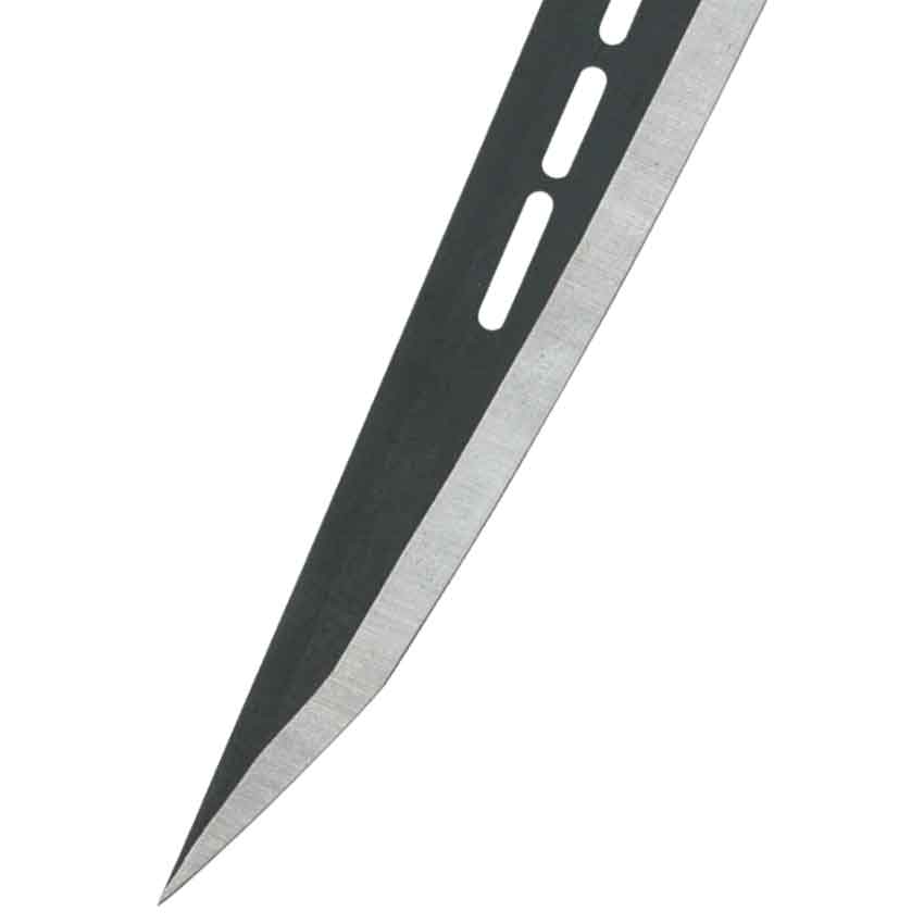 Just because it comes from fantasy does not mean that it is ineffective. In fact, you will find that this Fantasy Cleaver Sword is quite the opposite, as this mean-looking blade is every inch a brutal-looking sword that appears capable of hewing limbs with ease. The unique and distinctive shape of this decorative swords blade sets it firmly in the realm of fantasy. The blade is crafted entirely in blackened stainless steel and features numerous cut-outs to help mitigate its weight. The swords edge has a gentle curve, similar to a chefs knife. Meanwhile, the base of the blade features gentle, curved serrations, both on front and back. Also, there is a little notch at the base of the blade. The sword is full-tang and the all-metal hilt is wrapped in red faux leather to provide a secure grip. Included with the sword is a black nylon sheath. Monsters got you down? Not anymore they do not, because this Fantasy Cleaver Sword will make short work of any beastie in your path, whether its goblin, kobold, giant, troll, orc, werewolf, vampire, zombie, or anything else that might assail you from the pages of horror, fiction, or fantasy!