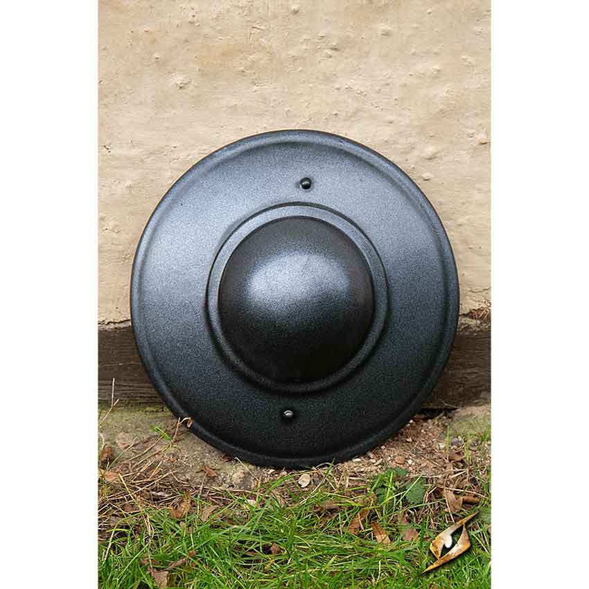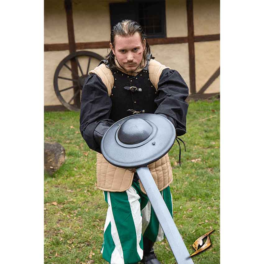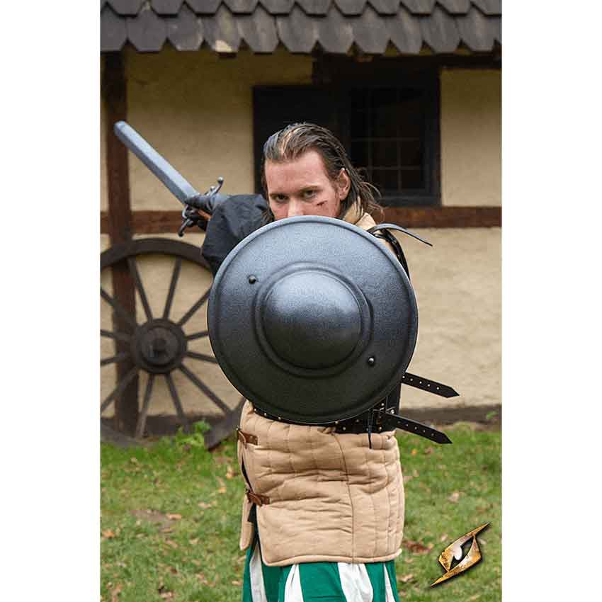 As you dash through the entryway, you hear a swordfight. With a sword and the Silver Fencing LARP Buckler in hand, you are ready to enter into combat. Crafted from hard EVA foam, this LARP shield has a latex coating and a durable construction. It has a steel coloring. Also, the buckler has a slightly domed base with a central boss. Highly realistic, this shield looks like its steel counterpart. Two simulated rivets adorn the front of the buckler next to the boss. On the back, the buckler has a black finish. Also, there is a bar with pointed ends, working as a grip in the center of the boss. The Silver Fencing LARP Buckler in hand looks right at home in a faire, LARP battle, or cosplay event.