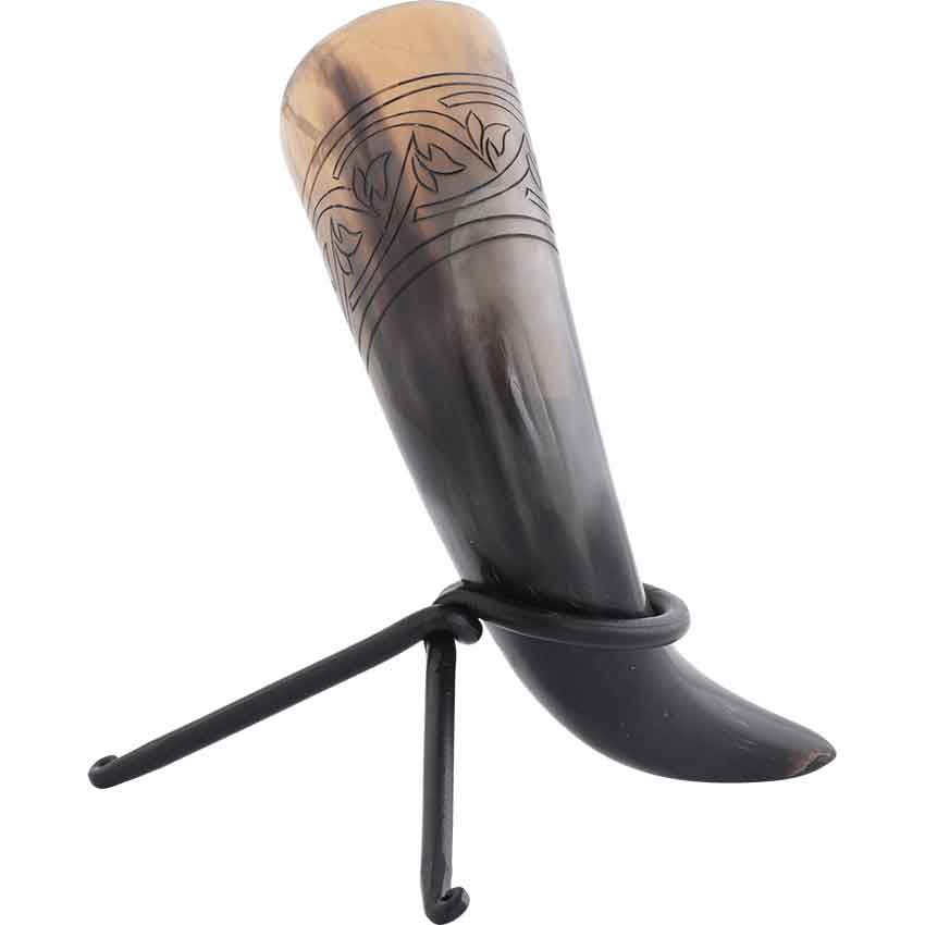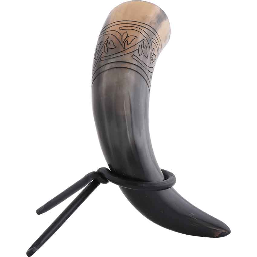 You and your friends have gathered at the tavern to tell your tales. You drink from the Floral Knotwork Drinking Horn before beginning your story. Being made of natural horn gives the drink-safe horn an authentic look and feel. On its upper half, the horn has an engraved knotwork pattern. Leaf-like details give the knotwork pattern a floral twist. The pattern wraps around the horn. It has two straight lines at the top and bottom of the design forming a border. The Floral Knotwork Drinking Horn looks great as part of a reenactment, LARP event, or cosplay costume. You can also use it to decorate your home or office by using one of our drinking horn stands. It also makes a functional accessory on an adventure with a drinking horn frog.