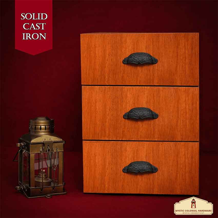 Each cabinet pull has an oil-blackened finish, giving it a rustic, traditional look. Each cup pull has a rounded shape with gently wavy bottom edges. An intricate, raised foliage pattern covers each drawer handle.