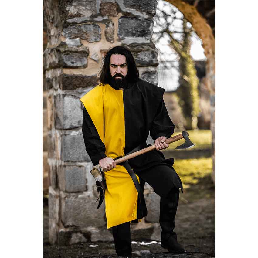 Crafted from pure cotton, this medieval tabard is a great addition to your medieval fantasy or historical outfit. This Frederick tabard has a vertical halved color scheme. This means each side is a different color. One side is black and the other is yellow. At the top, this medieval knight overcoat has a round neckline. The sides are completely open. Wear this tabard with your favorite belt to secure it at the waist. It is also sleeveless for added comfort and breathability. Slits on the front and back of this Frederick surcoat give you more mobility and make it easier to wear. This long black and yellow tabard ends at the calf for most.