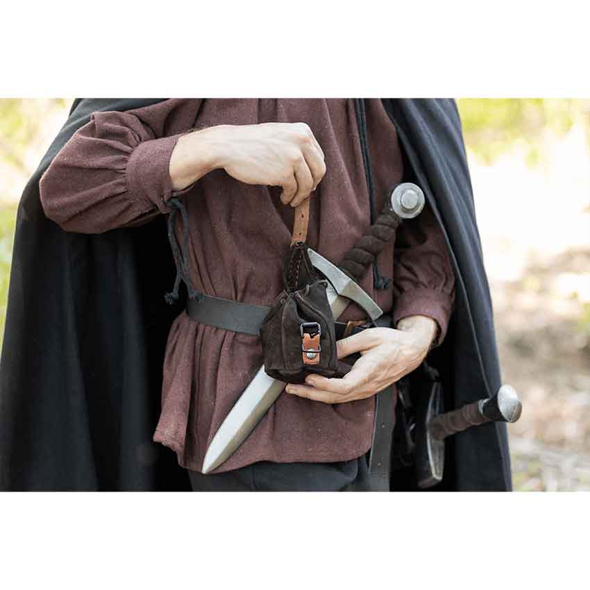 Featuring a leather string closure in addition to a buckle and leather strap, the Friedhelm Leather Pouch is ideal for storing small essentials without challenging the authenticity of your medieval reenactment outfits. Made of soft suede leather, this bag can be attached to a belt with a loop on its back, allowing you to keep your hands free while carrying it. Choose from a variety of colors which, when combined with this pouch style bag, are sure to complement any historic ensemble.