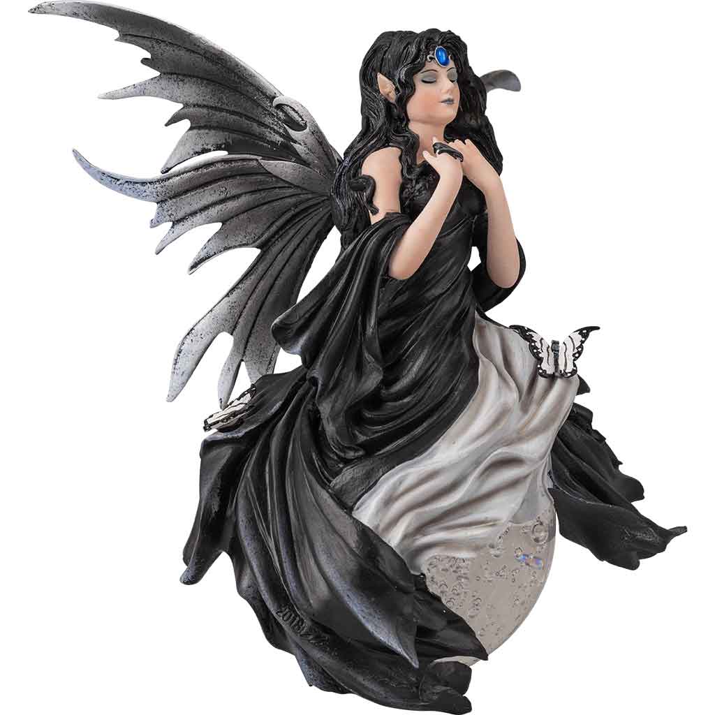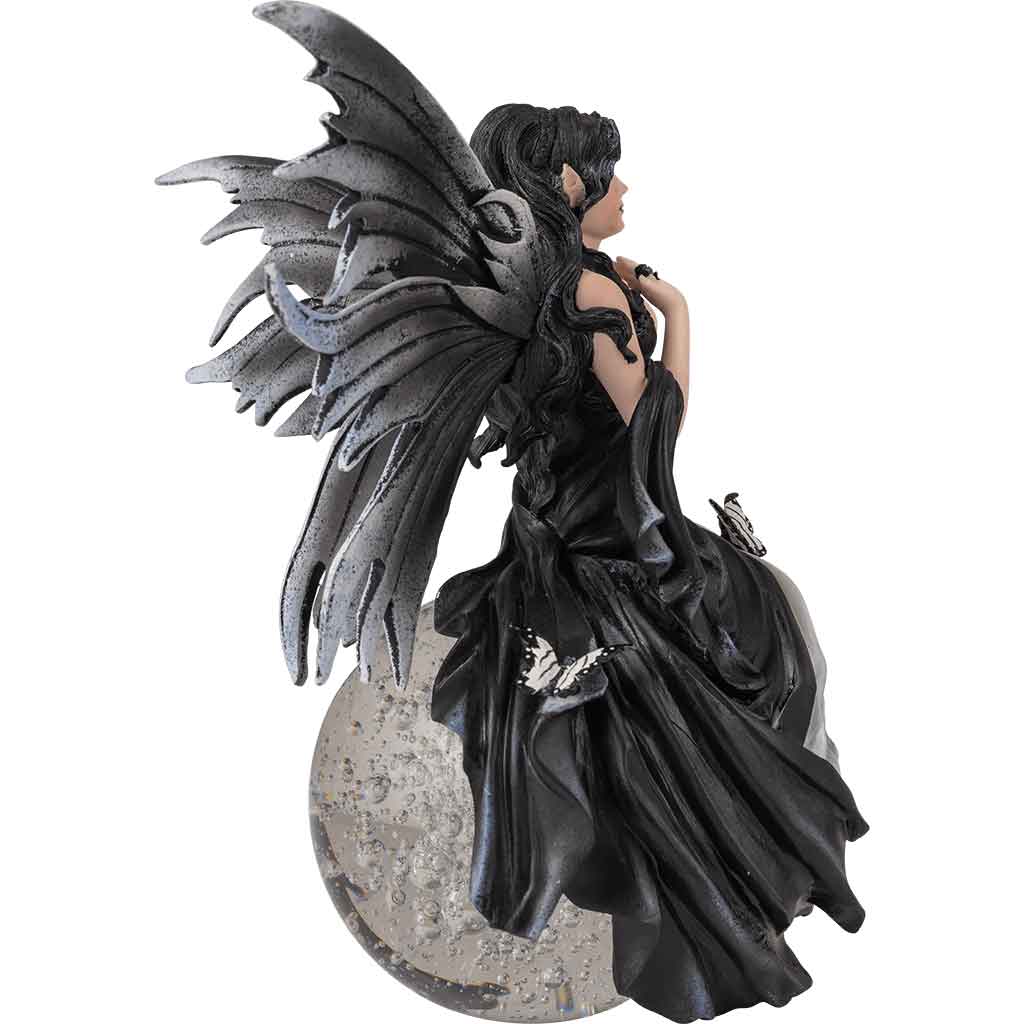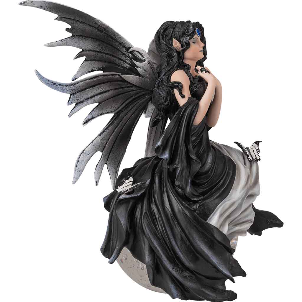 Fairies associate with many different forces of natures. The Gathering Storm Fairy Crystal Ball showcases a fairys relationship with the weather. This cold cast resin statue features a fairy with her eyes closed, feeling the building energies. She has black wings and is wearing a matching dress. A blue circlet adorns her head and a small butterfly sits on her lap. She is perched on a crystal ball. This statue is based off of artwork by Nene Thomas. It is hand painted, resulting in a highly detailed work of art. This resin statue makes a great home decor piece or wonderful gift for a friend.