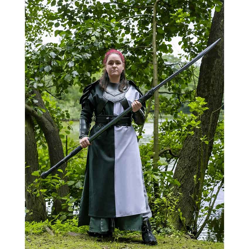 At the top, it has a round neckline and short, wide sleeves. These short, wide sleeves allow freedom of movement and are reminiscent of medieval styles. On both sides, this Mytholon tabard has adjustable lacing tied through metal eyelets. Beneath the lacing, slits on both sides of the knight tabard gives you more mobility and breathability. Available in multiple sizes, this tabard accommodates a wide range of body types. It’s a versatile layering piece, whether you’re a scion of chivalrous houses or a stalwart soldier in a medieval army.