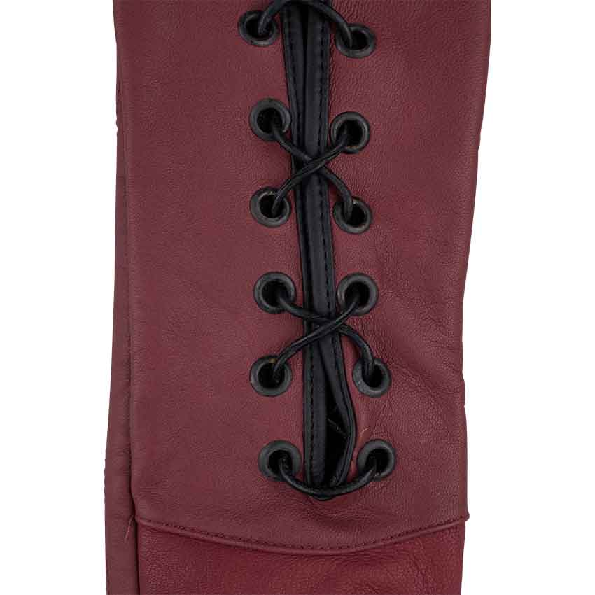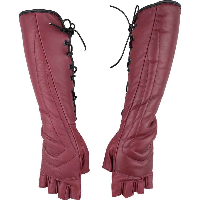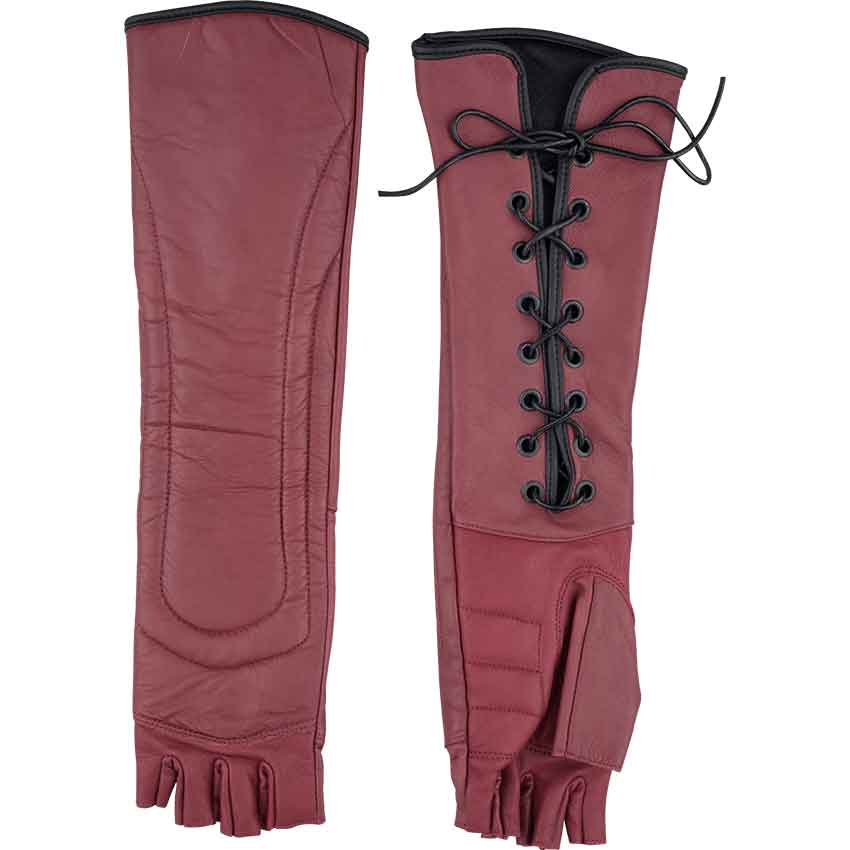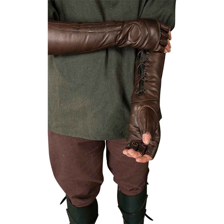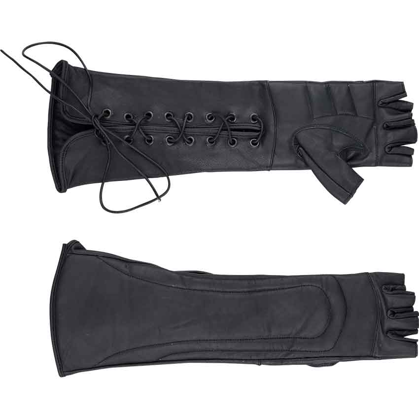 Whether you are a mercenary, rogue, or other cunning character, you should have a great pair of gloves. Add the Gillian Gloves to your fantasy outfit. Made from sheep leather, this pair of fingerless gloves comes in three sizes and two color options. The sheep leather makes these gloves soft and flexible. Next, these gloves reach from the fingers to nearly the elbow, depending on the wearers size. These gloves secure to the arms with lacing from below the wrist to the elbow. Stitching on the front adds a quilted look for a unique detail. With their versatile design, the Gillian Gloves add the perfect finishing touch to a variety of cosplay ensembles. Wear them to your next LARP event or as part of a theatrical production.