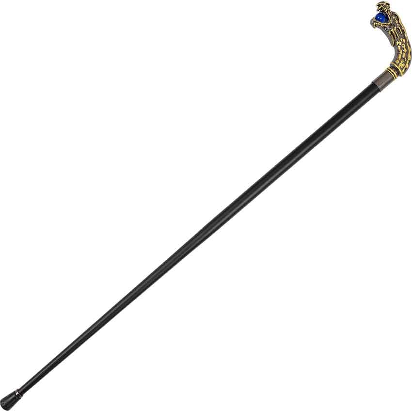 Forged from stainless steel, this completely decorative sword cane is inspired by a fearsome dragon aesthetic and serves as a convenient walking aid. Stainless steel is renowned for its durability and rust resistance. The head is designed like a roaring golden dragon with a faux blue round gem in its mouth. The golden dragon has intricately textured scales and a face.