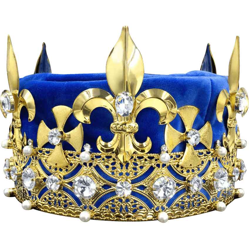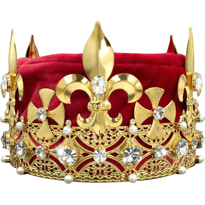 Become truly royal with the perfect crown. Wear the Golden King’s Crown with crystals so that all may know that you are in charge. Made from gold-plated metal, this royal crown features a tall band at the bottom with fleur-de-lis peaks along the top. Crosses sit in between the fleurs-de-lis. Diamond shapes and curved detailing adorn the band. In addition, clear synthetic gemstones and faux pearls accent the frame throughout.
