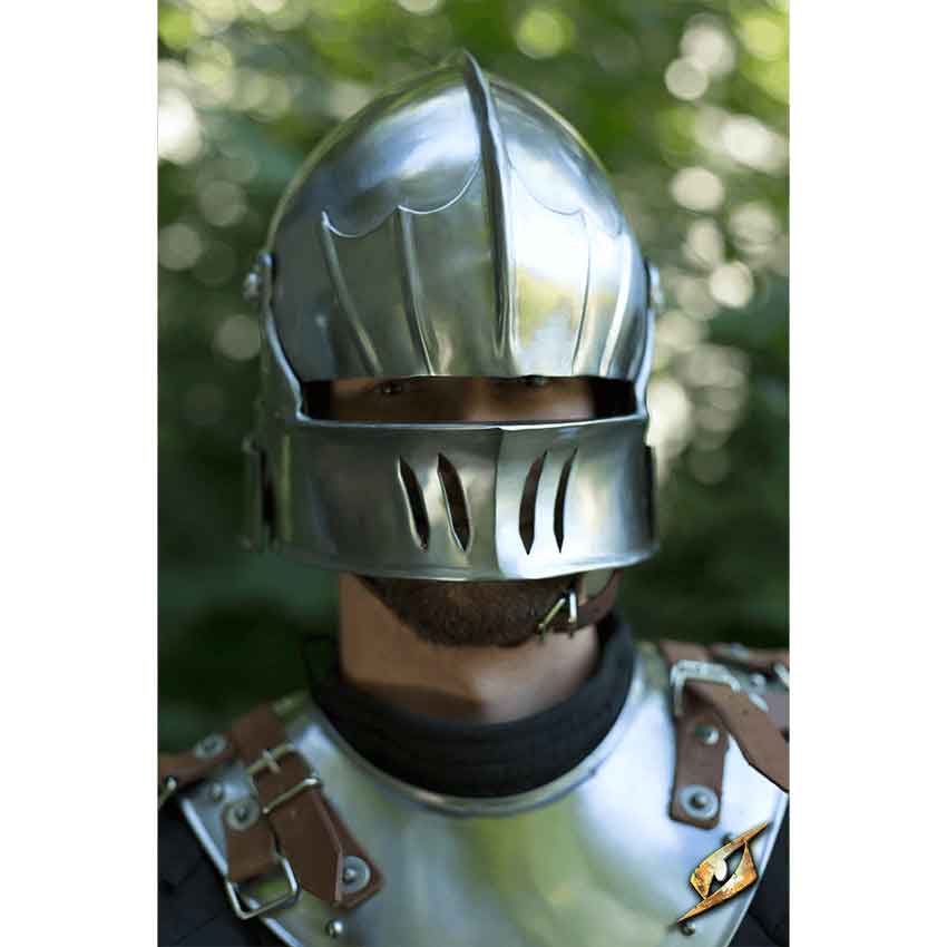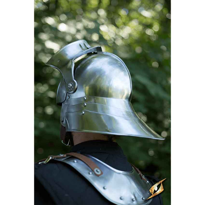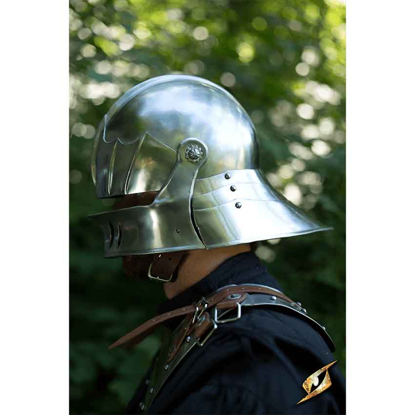 Create a suit of armour befitting a German knight from the 15th century by including the Gothic Sallet Helmet. The descendent of the Italian bascinet, this war helmet became the preferred choice of armour for over a hundred years. Inspired by the classic gothic style, the Sallet features fluting and ridge work that enhances the look and strength of the armour. A rounded top with raised centerline further increases the defensive power. The bellows visor swivels up and down for easy adjustment, and possesses cutouts for ventilation. Metal lames form a lobster neck-plate in the back. Foam padding lines the interior, while an adjustable buckle strap secures the helmet at the chin. A polished steel finish creates the knight in shining armour look.