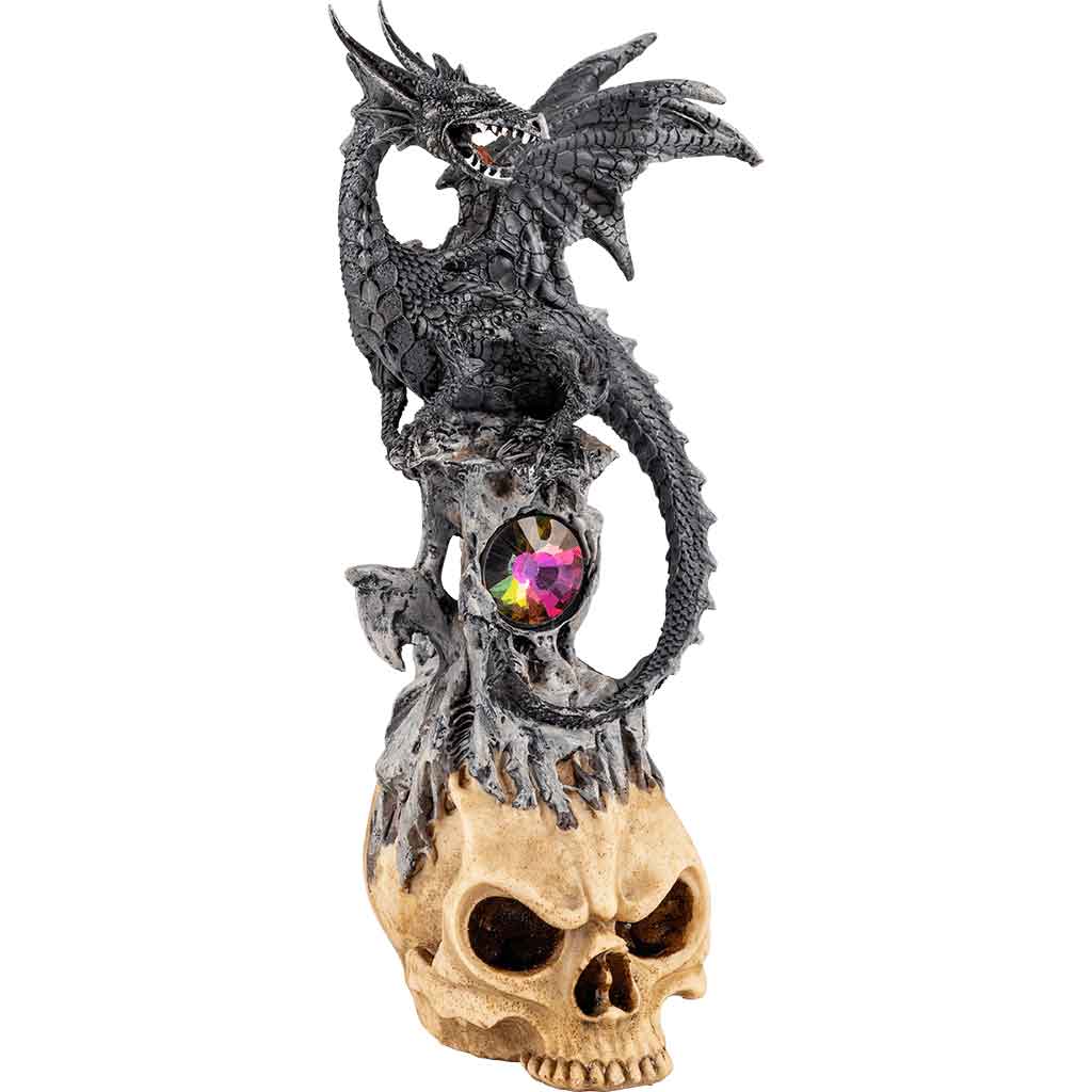 Anyone who dares try and steal the beautiful jewel from this skull is sure to be greeted by its winged guardian! Enhance your home decor with the unique design and striking craftsmanship of this Gray Dragon on Jeweled Skull Statue. Made of cold cast resin, this statue is hand painted with eye-catching details. A large gray dragon is featured in this statue with its mouth open in a screech. The dragon is perched on a stalk, which grows out of the head of a weathered skull beneath. The stalk is embellished with a multi-colored jewel, adding an enchanting appeal. This Gray Dragon on Jeweled Skull Statue makes a fantastic gift idea for a loved one who enjoys both gothic and fantasy style!