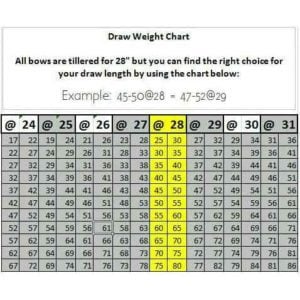 - The Draw Weight of a bow is measured in pounds and corresponds to the amount of force required to pull back the bow string. It is best to pick a draw weight that you can handle. All of the bows have a draw length of 28 inches. To match your draw weight to its equivalent in the 28 inch draw length, use the chart above. Find your draw length and weight and slide over along the row to the corresponding draw weight range under the 28 header. For example if you use a bow that is 47-52 pounds at 24 inches, you will use the bow of 55-60 pounds at a 28 inch draw.