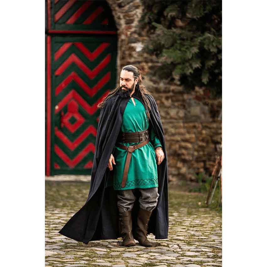 Designed with a full-length drape, this medieval cloak offers an imposing silhouette that complements your historical attire. The button at the neckline secures the cloak, keeping it over your shoulders as you move.