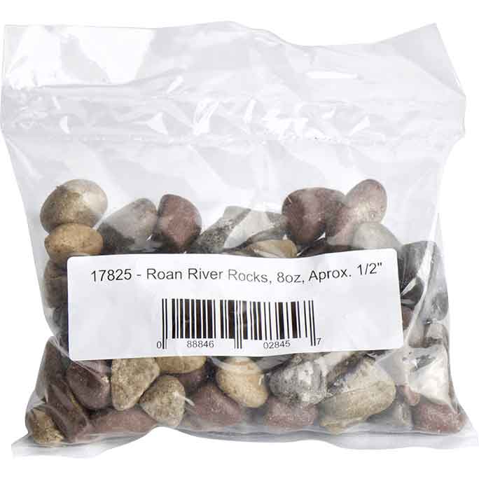 Whether you are creating a mini village or fairy garden, the 8 Ounces of Half Inch Roan River Rocks make a great piece of scenery. This bag includes 8 ounces of rocks. The smooth river rocks have a natural variation in their colors and shapes. This adds a sense of realism to any display. You can add this package of half inch Roan River rocks to a tiny garden display or landscape scene.