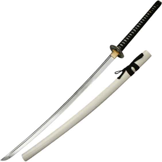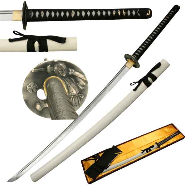 The sword comes with a white wooden scabbard, or saya, as well as a sword bag, box, and display stand. This sword is great for historical reenactments and other realistic battles.