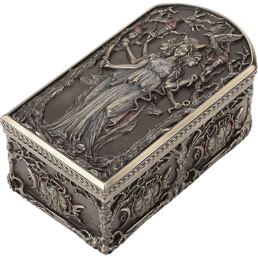 As the Greek goddess of crossroads and witchcraft, Hecate was a triple form goddess. The Hecate Trinket Box depict the goddess in her multiple forms. Made from cold cast bronze, this hand-painted trinket box shows three women standing as one. One figure wears a green gown while the center figure wears a blue dress and the third has a purple dress. All of the figures hold an item associated with the goddess, from torches to keys. Also, the figures stand next to dead trees. Behind them are two dogs, one on each side. A raven flies above them. The triple form of the goddess continues onto the sides of the arched box. Their faces are surrounded by a red ring as a part of the triple moon symbol. Add this trinket box to any classical home decor or Greek mythology collection. It also makes a great gift for a Wiccan.