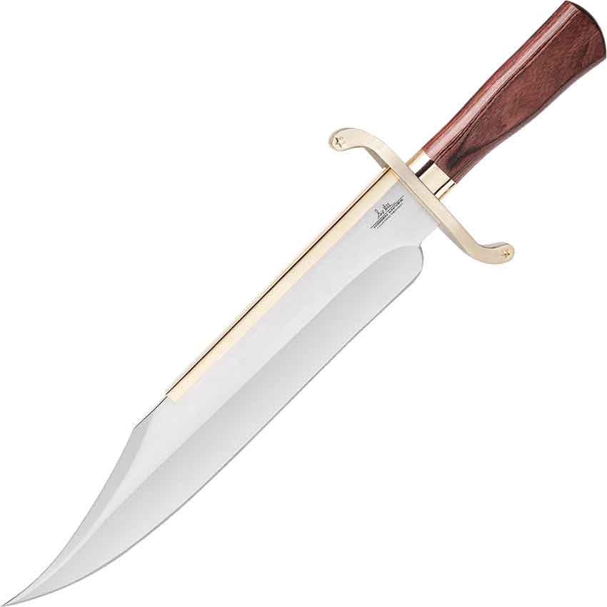 The Hibben Old West Bowie has a large and hefty design, perfect for a variety of tasks, especially for adventures in the wilderness. Made from stainless steel, this functional knife features the clip-point tip typical of bowie knives. It has a long spine with a gold-plated blade catcher along the top. At the base of the wide blade, there is the Gil Hibben signature.
