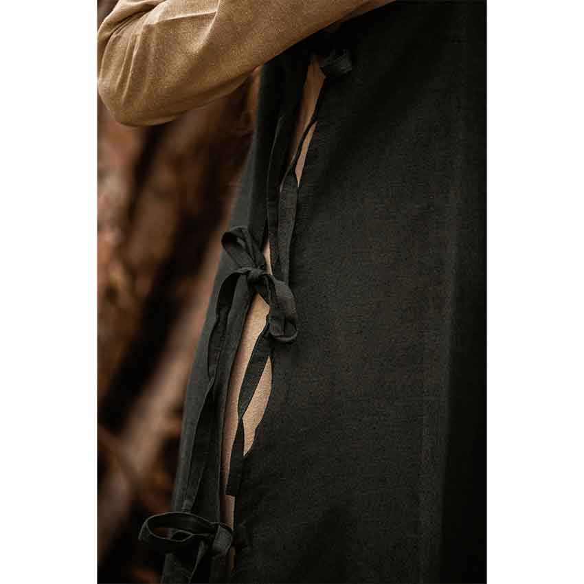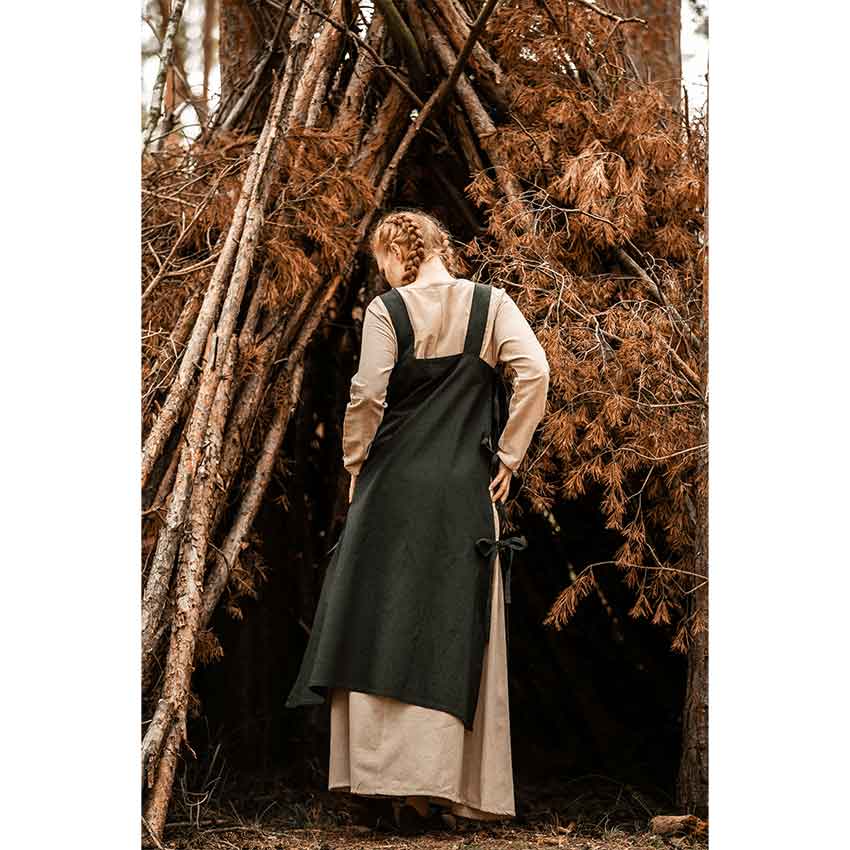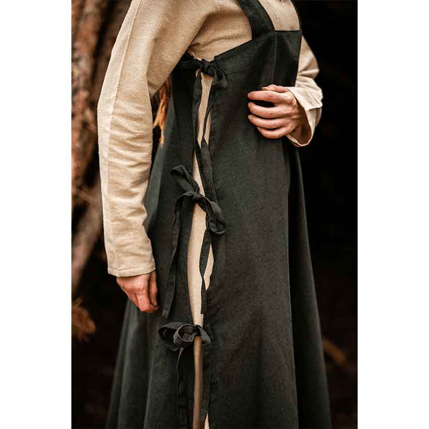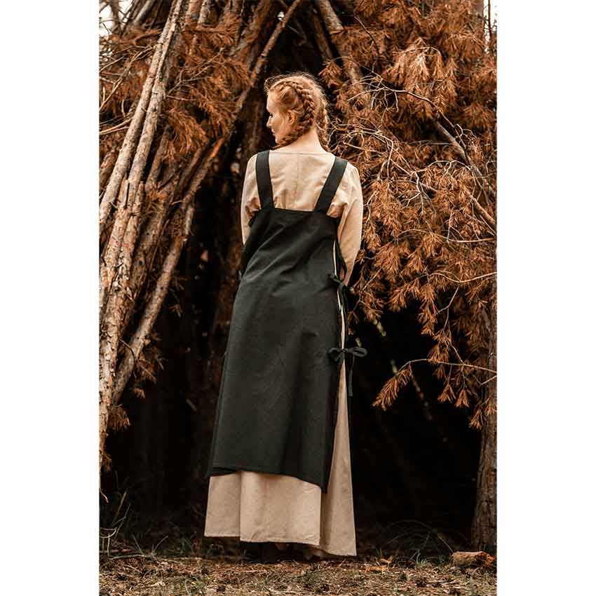 You can add some color to your favorite Viking outfit while keeping a classic silhouette when you wear the Green Hildegard Viking Overdress. Made from 100% cotton, this green Norse overdress comes in three sizes. It secures with multiple ties on the sides of the dress. The sleeveless overdress features the typical square neckline common to apron dresses. Also, the Viking dress ends at the shins.