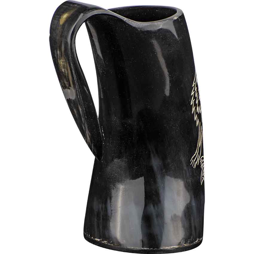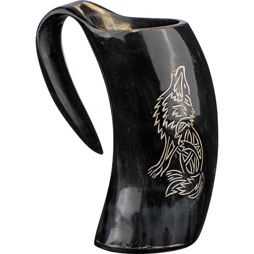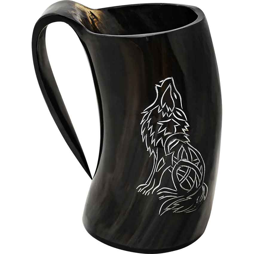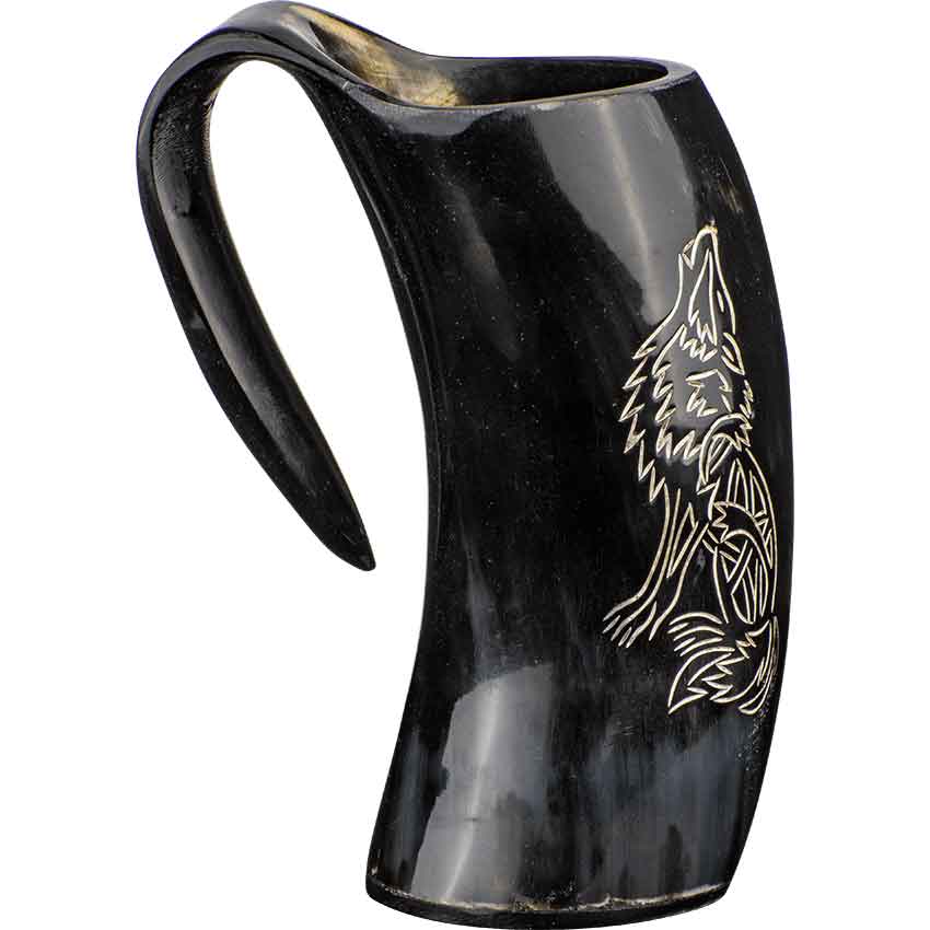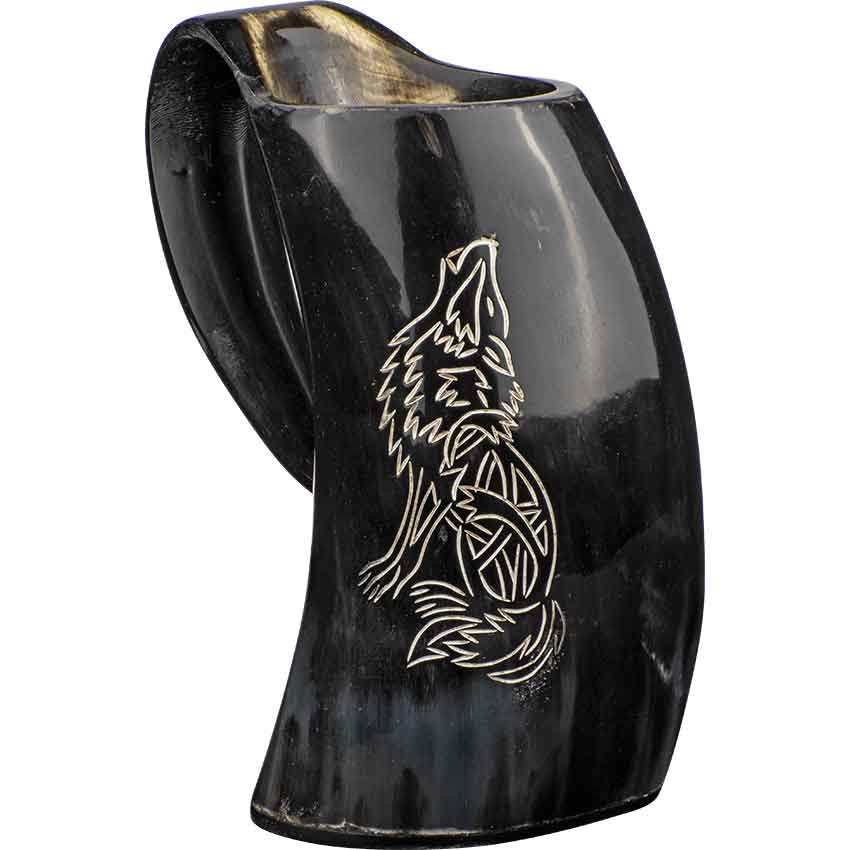 If you have an affinity with wolves, then toast to the animal and then drink from the Howling Wolf Horn Tankard at any medieval feast. A single piece of natural cow horn forms the main body and handle of the tankard. A second piece of horn completes the bottom. On the side, the tankard features an engraved design. The design depicts a sitting wolf. The wolf sits back on its hind legs and has its head tilted upwards. Its mouth is open as if the wolf is howling. This tankard is drink safe and wonderful for drinking your preferred beverage. The tankard is great for a variety of events such as Renaissance faires. You can add it to a fantasy outfit or cosplay costume as a unique accessory. It also looks wonderful on display in your home or office.
