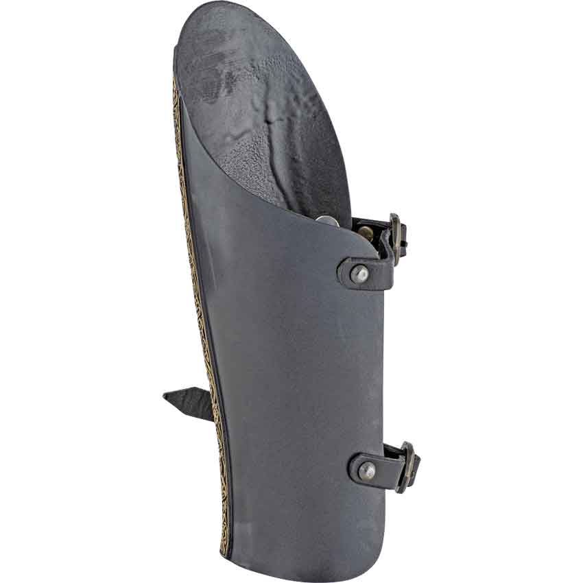 As an experienced warrior, you know the importance of wearing armour, no matter what the situation. You wear the Huscarl Bracers to protect your arms. These polyurethane bracers come as a pair. As they are polyurethane, they are lightweight and comfortable to wear. Lighter than fully leather or steel pieces, this armour is great for warm weather. To secure them, they have adjustable leather straps which go around the upper arms. Each bracer has two straps. Next, the black bracers are wider near the wearers elbows and get slightly narrower towards the wrists. There is a brass-colored strip that runs the length of each bracer. Ornate knotwork detailing adorns the strip. Wear the Huscarl Bracers to your next roleplaying event or cosplay convention.