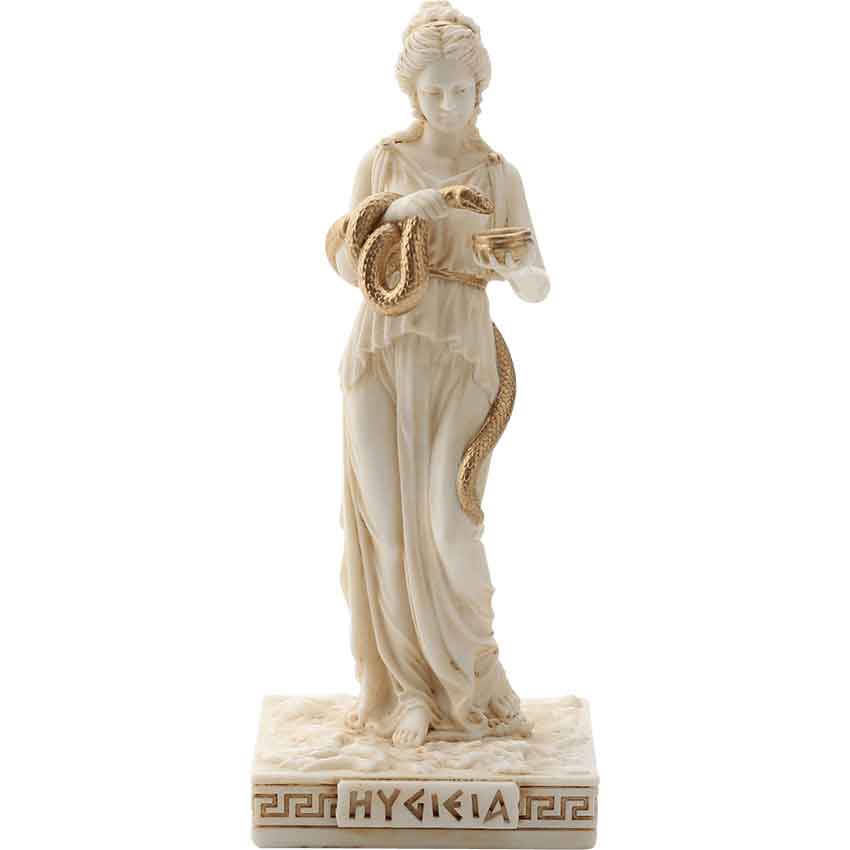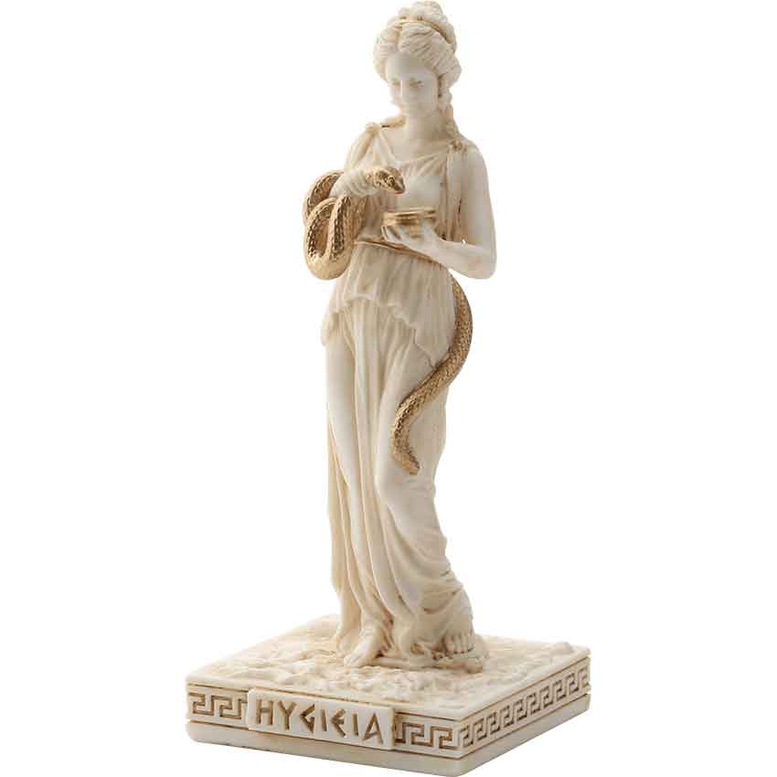 This daughter of Asclepius lends her name to the word hygiene as health, cleanliness, and sanitation were her domains. In addition, the goddess was named in the original Hippocratic oath for medical practitioners. A 1st century statue included the snake and bowl aspects shown here.