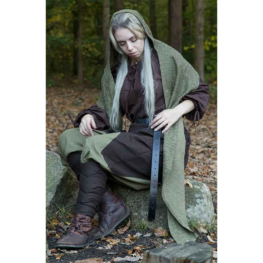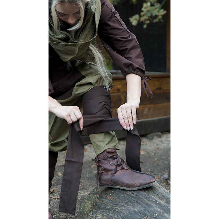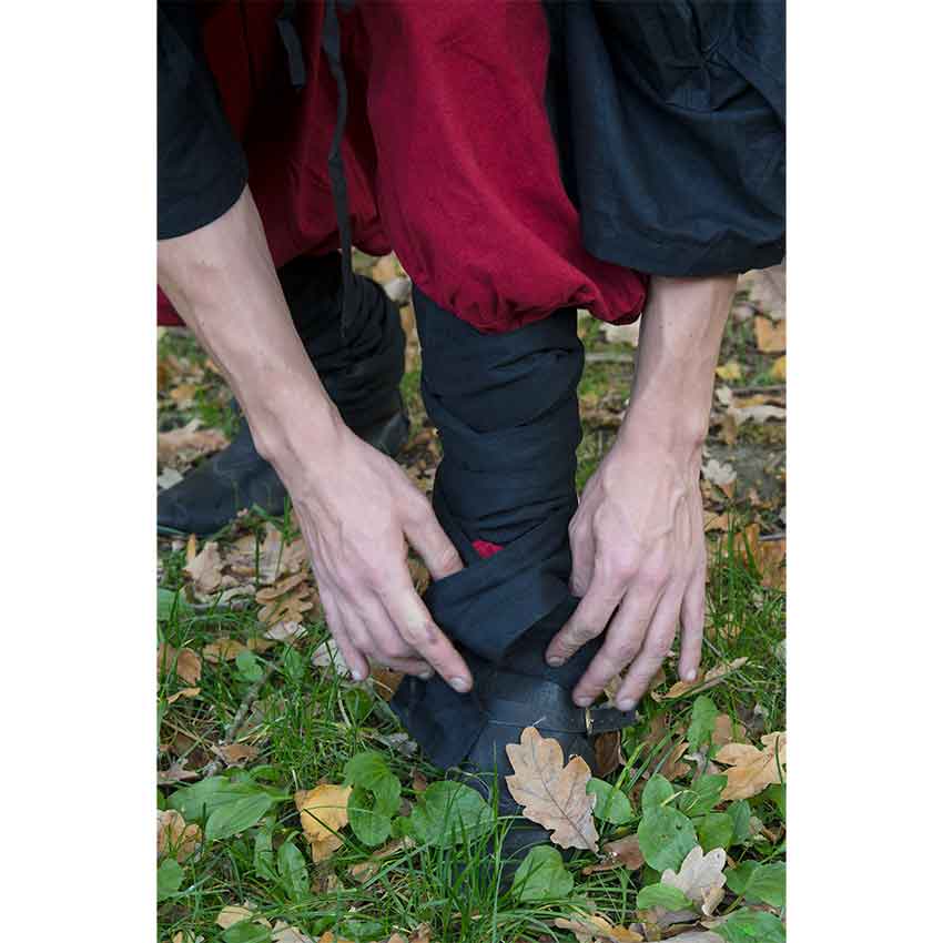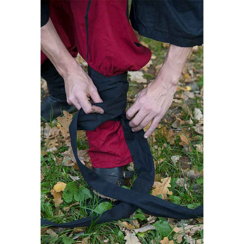 With their roomy fit and undeniable medieval flair, the Ignis Pants are perfect for your next LARP, reenactment, or costuming adventure. These cotton twill pants have a two-color style and come in both adult and childrens sizes. These medieval pants have a loose-fitting shape from the waist down to beneath the knee. The waist is gathered with elastic for secure yet generous fit. Attached belt loops make these the perfect pants to wear with your favorite medieval belt. The long, roomy legs are pleated at the top and feature the main color as their outer and the second color as their inner accent. The pant legs fit more closely at the shins to keep movement unhindered. These fitted pant legs come with their own set of two matching legwraps. The Ignis Pants can be worn by men, women, and children, and they feature handy pockets for storing small essentials. Choose from a great range of sizes and colors, including brown with green accent and black with red accent to better match your Viking, medieval, or fantasy look.